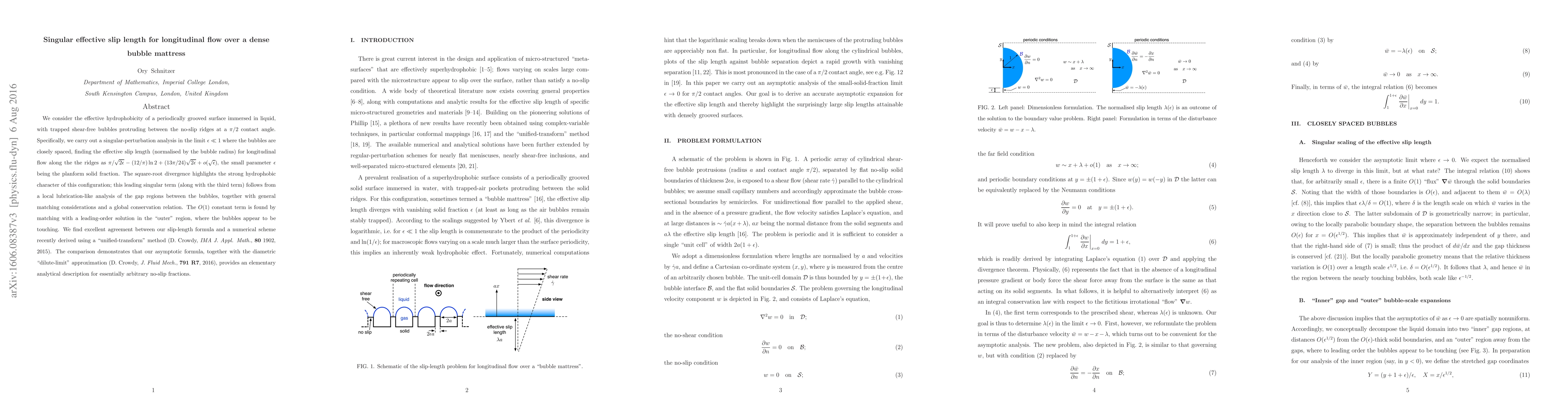 We consider the effective hydrophobicity of a periodically grooved surface immersed in liquid, with trapped shear-free bubbles protruding between the no-slip ridges at a $\pi/2$ contact angle. Specifically, we carry out a singular-perturbation analysis in the limit $\epsilon\ll1$ where the bubbles are closely spaced, finding the effective slip length (normalised by the bubble radius) for longitudinal flow along the the ridges as ${\pi}/{\sqrt{2\epsilon}}-(12/\pi)\ln 2 + (13\pi/24)\sqrt{2\epsilon}+ o(\sqrt{\epsilon})$, the small parameter $\epsilon$ being the planform solid fraction. The square-root divergence highlights the strong hydrophobic character of this configuration; this leading singular term (along with the third term) follows from a local lubrication-like analysis of the gap regions between the bubbles, together with general matching considerations and a global conservation relation. The $O(1)$ constant term is found by matching with a leading-order solution in the "outer'" region, where the bubbles appear to be touching. We find excellent agreement between our slip-length formula and a numerical scheme recently derived using a "unified-transform" method (D. Crowdy, IMA J. Appl. Math., 80 1902, 2015). The comparison demonstrates that our asymptotic formula, together with the diametric "dilute-limit" approximation (D. Crowdy, J. Fluid Mech., 791 R7, 2016), provides an elementary analytical description for essentially arbitrary no-slip fractions.