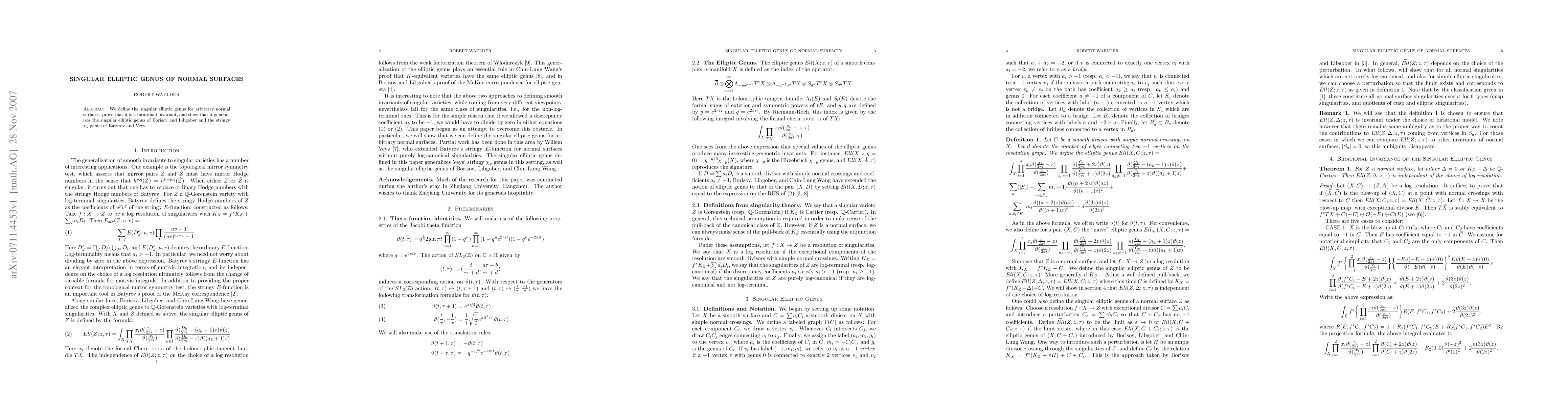 Summary: This paper introduces the singular elliptic genus for normal surfaces, demonstrating its birational invariance and its generalization of existing genera, including those by Borisov-Libgober and Batyrev-Veys.