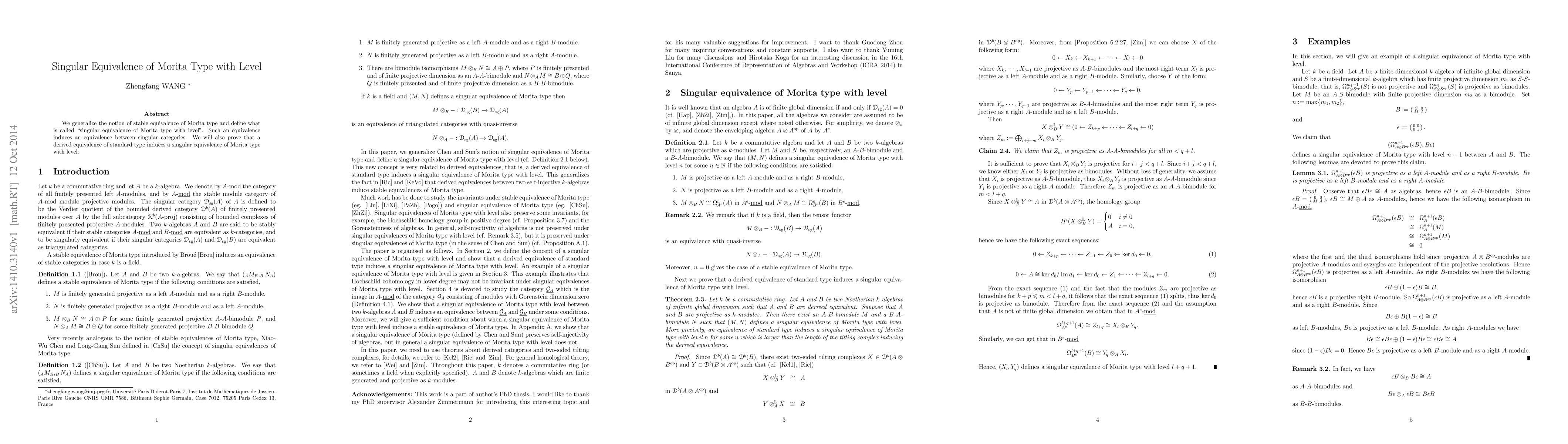 The paper generalizes stable equivalence of Morita type to "singular equivalence of Morita type with level," establishing a connection between singular categories and proving that derived equivalence of standard type induces this new type of singular equivalence.