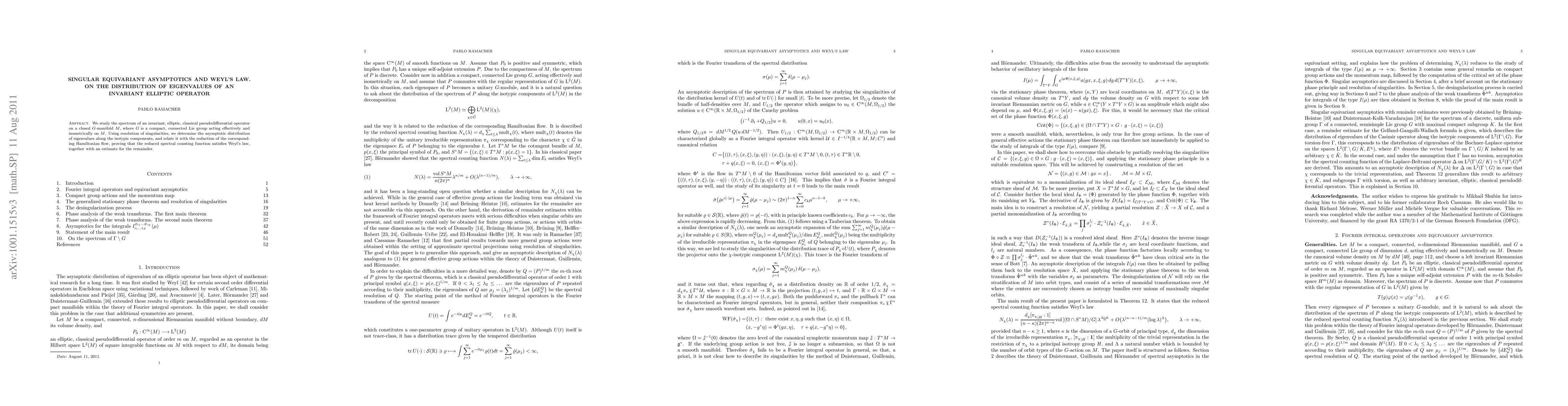 We study the spectrum of an invariant, elliptic, classical pseudodifferential operator on a closed G-manifold M, where G is a compact, connected Lie group acting effectively and isometrically on M. Using resolution of singularities, we determine the asymptotic distribution of eigenvalues along the isotypic components, and relate it with the reduction of the corresponding Hamiltonian flow, proving that the equivariant spectral counting function satisfies Weyl's law, together with an estimate for the remainder.