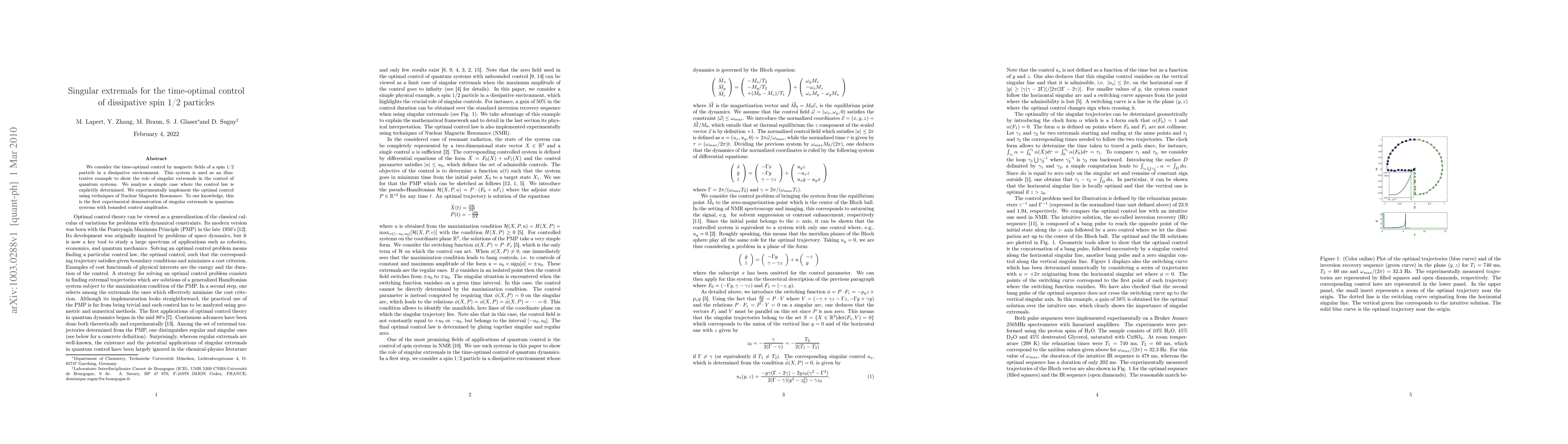 This paper investigates the time-optimal control of dissipative spin 1/2 particles using magnetic fields, focusing on singular extremals in quantum systems. The authors experimentally implement optimal control using nuclear magnetic resonance, marking the first demonstration of singular extremals in quantum systems with bounded control amplitudes.