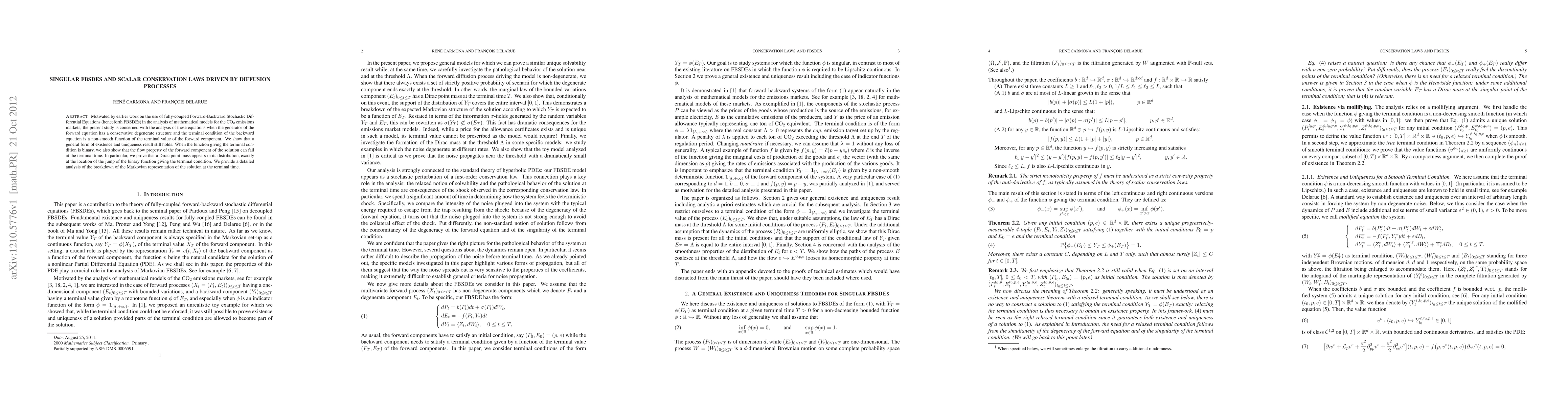 Motivated by earlier work on the use of fully-coupled Forward-Backward Stochastic Differential Equations (henceforth FBSDEs) in the analysis of mathematical models for the CO2 emissions markets, the present study is concerned with the analysis of these equations when the generator of the forward equation has a conservative degenerate structure and the terminal condition of the backward equation is a non-smooth function of the terminal value of the forward component. We show that a general form of existence and uniqueness result still holds. When the function giving the terminal condition is binary, we also show that the flow property of the forward component of the solution can fail at the terminal time. In particular, we prove that a Dirac point mass appears in its distribution, exactly at the location of the jump of the binary function giving the terminal condition. We provide a detailed analysis of the breakdown of the Markovian representation of the solution at the terminal time.
