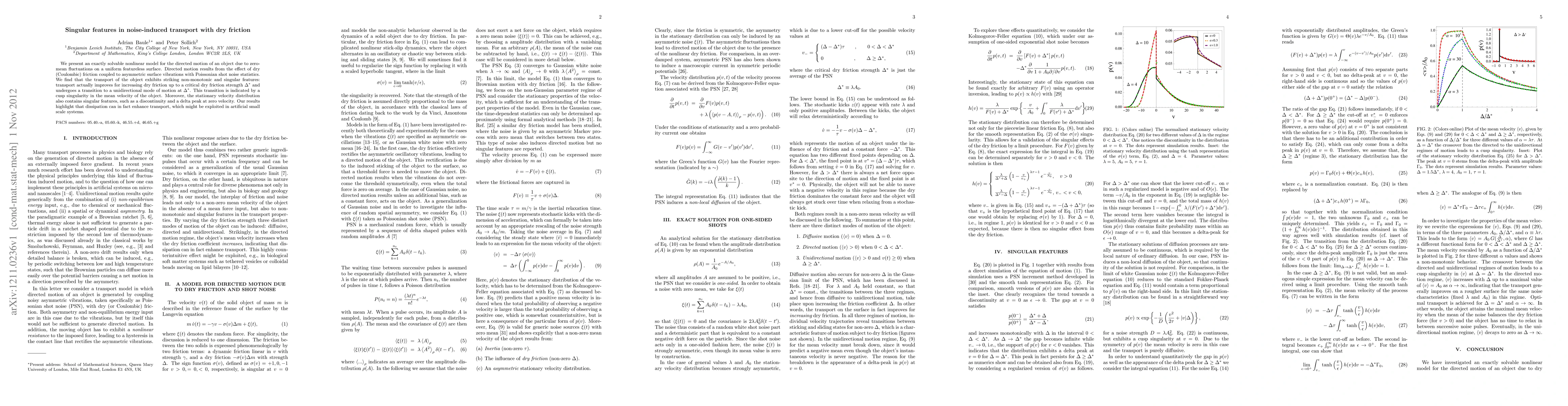 Summary: This study models directed motion of an object under dry friction and Poissonian noise, revealing that increased friction can enhance transport up to a critical point, marked by a cusp singularity in mean velocity, and characterized by singular features in the velocity distribution. These findings suggest that dissipation may boost transport in small-scale artificial systems.