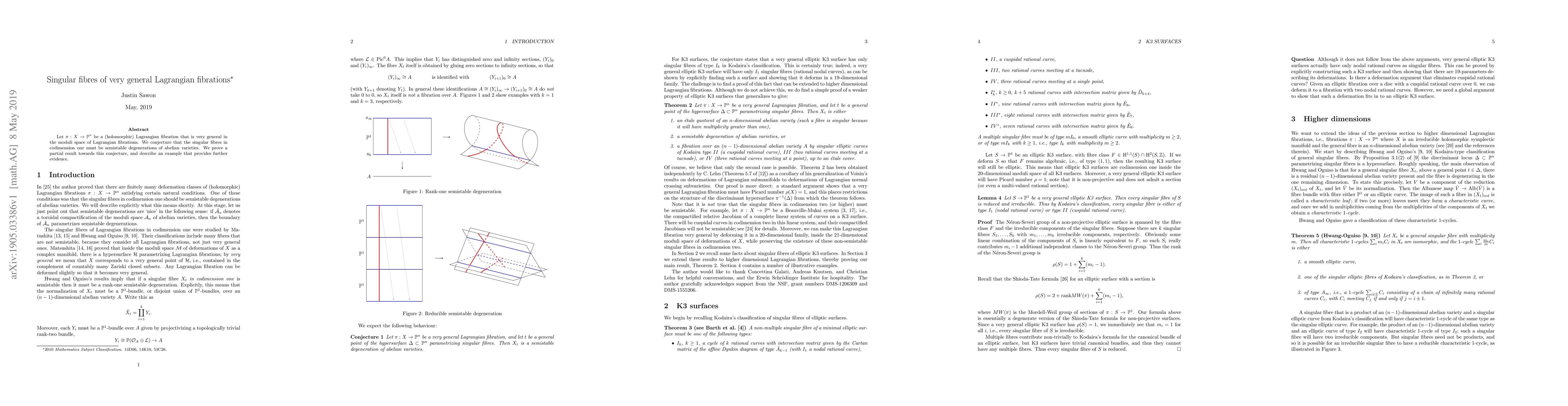 This paper investigates singular fibres in very general Lagrangian fibrations, proposing that these fibres are semistable degenerations of abelian varieties. The authors provide a partial proof supporting the conjecture and present an illustrative example to bolster their findings.