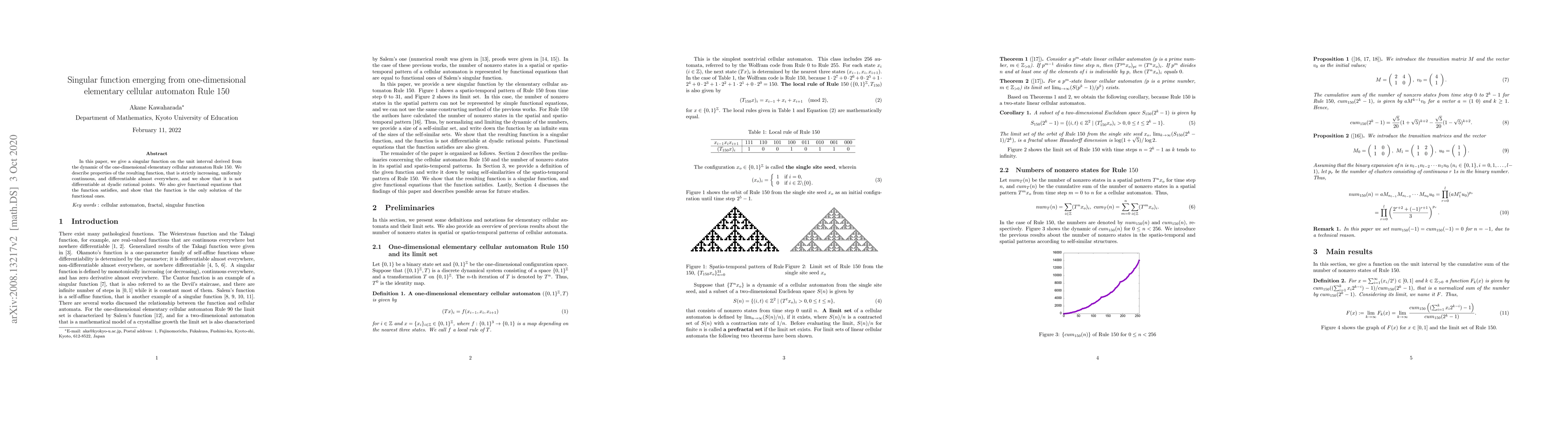 This paper derives a singular function from the dynamics of Rule 150 cellular automaton, demonstrating it is strictly increasing, uniformly continuous, and differentiable almost everywhere, but not at dyadic rational points. It also identifies functional equations uniquely satisfied by this function.