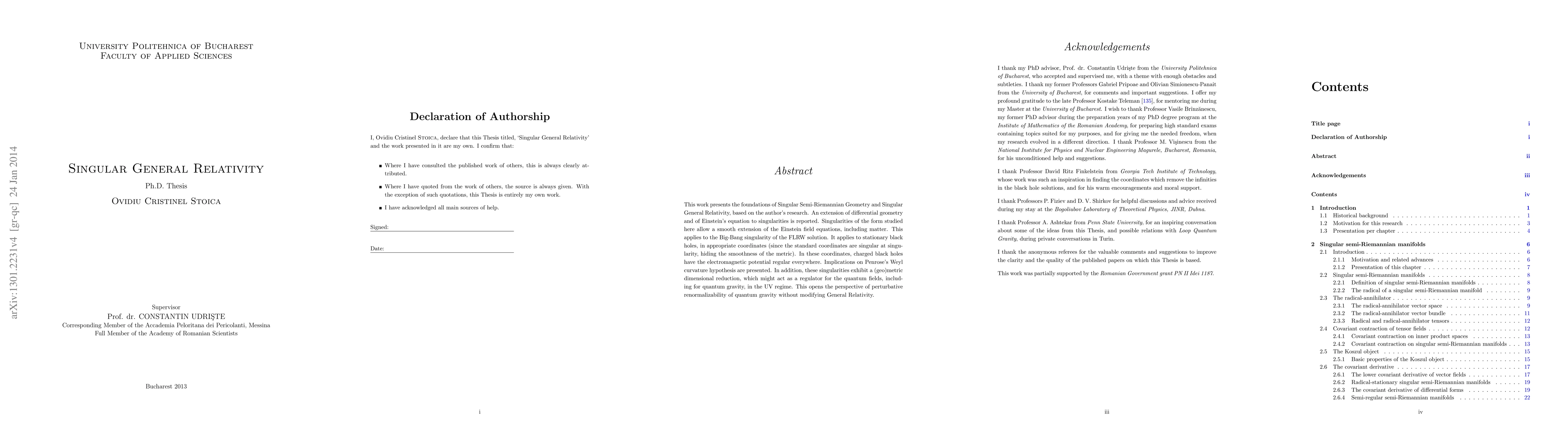 This work presents the foundations of Singular Semi-Riemannian Geometry and Singular General Relativity, based on the author's research. An extension of differential geometry and of Einstein's equation to singularities is reported. Singularities of the form studied here allow a smooth extension of the Einstein field equations, including matter. This applies to the Big-Bang singularity of the FLRW solution. It applies to stationary black holes, in appropriate coordinates (since the standard coordinates are singular at singularity, hiding the smoothness of the metric). In these coordinates, charged black holes have the electromagnetic potential regular everywhere. Implications on Penrose's Weyl curvature hypothesis are presented. In addition, these singularities exhibit a (geo)metric dimensional reduction, which might act as a regulator for the quantum fields, including for quantum gravity, in the UV regime. This opens the perspective of perturbative renormalizability of quantum gravity without modifying General Relativity.