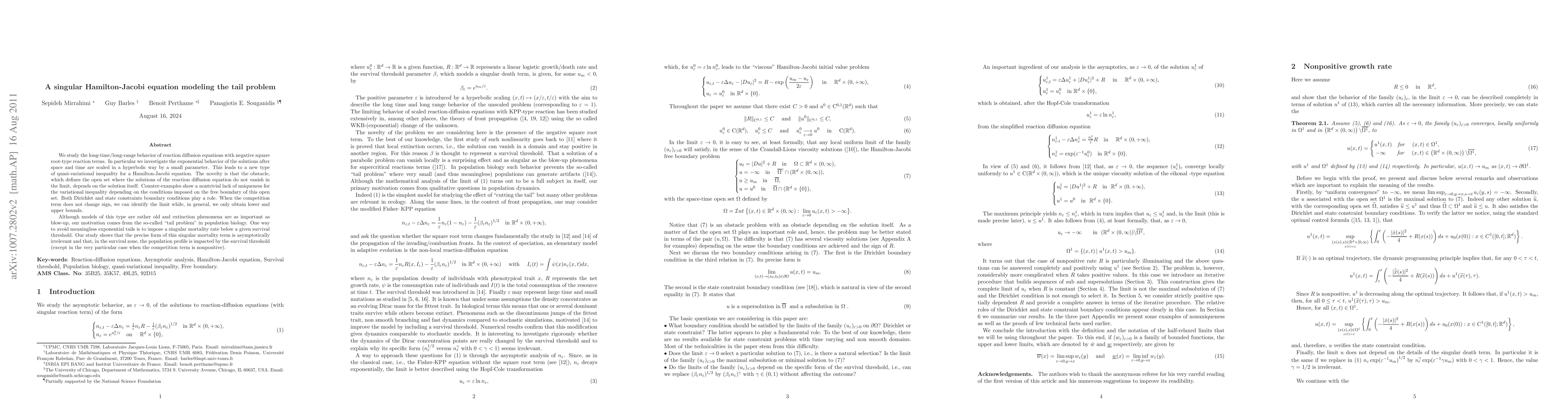 In this paper we study the long time-long range behavior of reaction diffusion equations with negative square root -type reaction terms. In particular we investigate the exponential behavior of the solutions after a standard hyperbolic scaling. This leads to a Hamilton-Jacobi variational inequality with an obstacle that depends on the solution itself and defines the open set where the limiting solution does not vanish. Counter-examples show a nontrivial lack of uniqueness for the variational inequality depending on the conditions imposed on the boundary of this open set. Both Dirichlet and state constraints boundary conditions play a role. When the competition term does not change sign, we can identify the limit, while, in general, we find lower and upper bounds for the limit. Although models of this type are rather old and extinction phenomena are as important as blow-up, our motivation comes from the so-called "tail problem" in population biology. One way to avoid meaningless exponential tails, is to impose extra-mortality below a given survival threshold. Our study shows that the precise form of this extra-mortality term is asymptotically irrelevant and that, in the survival zone, the population profile is impacted by the survival threshold (except in the very particular case when the competition term is non-positive).