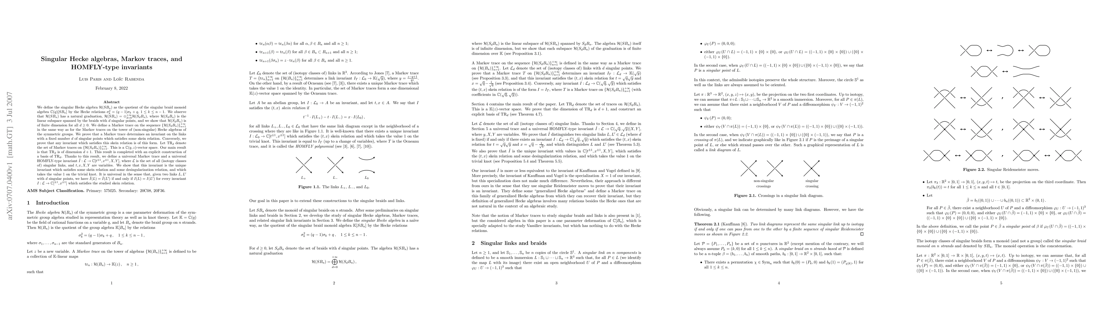 The paper defines singular Hecke algebras and Markov traces, showing a one-to-one correspondence between the traces and skein invariants, ultimately leading to a universal HOMFLY-type invariant capable of distinguishing singular links.