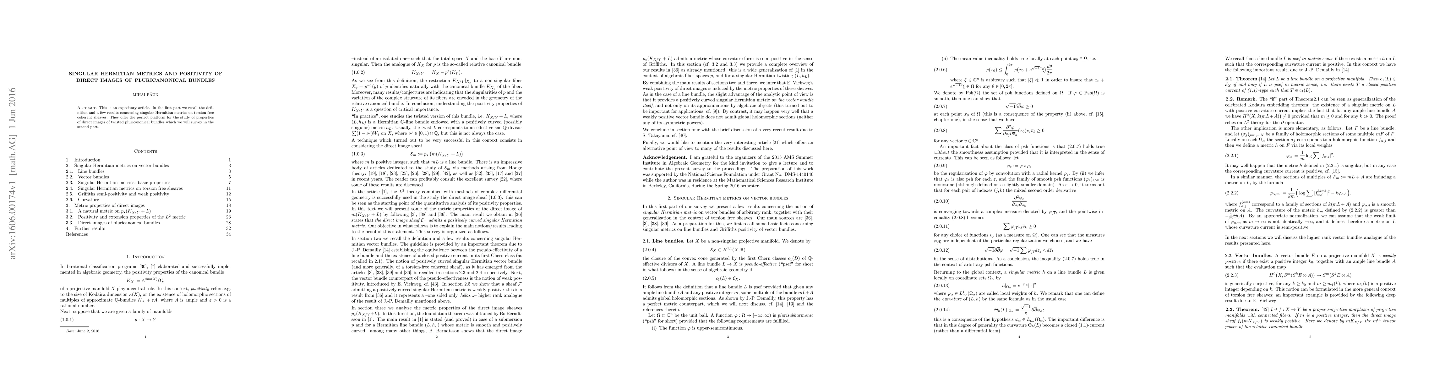 Summary: This expository article reviews singular Hermitian metrics on torsion-free coherent sheaves and discusses their role in studying the positivity of direct images of twisted pluricanonical bundles. The second part surveys properties of these direct images.