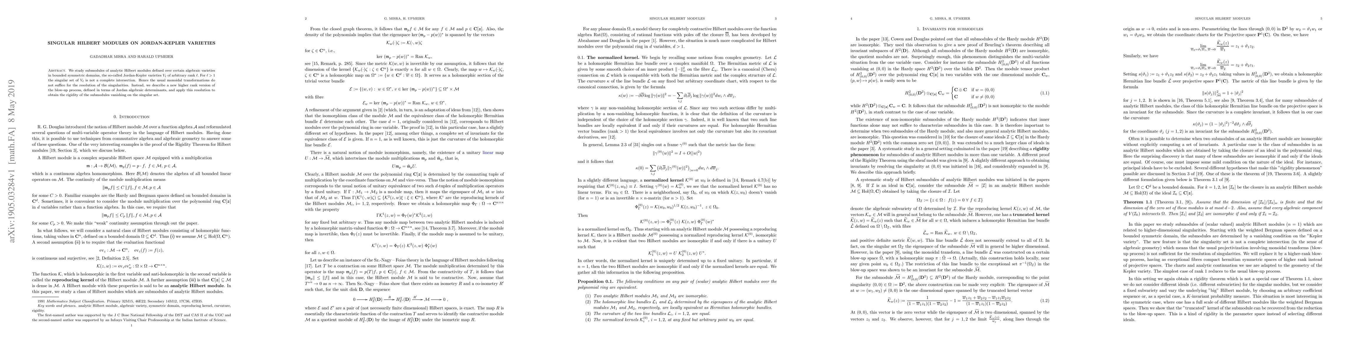 We study submodules of analytic Hilbert modules defined over certain algebraic varieties in bounded symmetric domains, the so-called Jordan-Kepler varieties $V_\ell$ of arbitrary rank $\ell.$ For $\ell>1$ the singular set of $V_\ell$ is not a complete intersection. Hence the usual monoidal transformations do not suffice for the resolution of the singularities. Instead, we describe a new higher rank version of the blow-up process, defined in terms of Jordan algebraic determinants, and apply this resolution to obtain the rigidity of the submodules vanishing on the singular set.