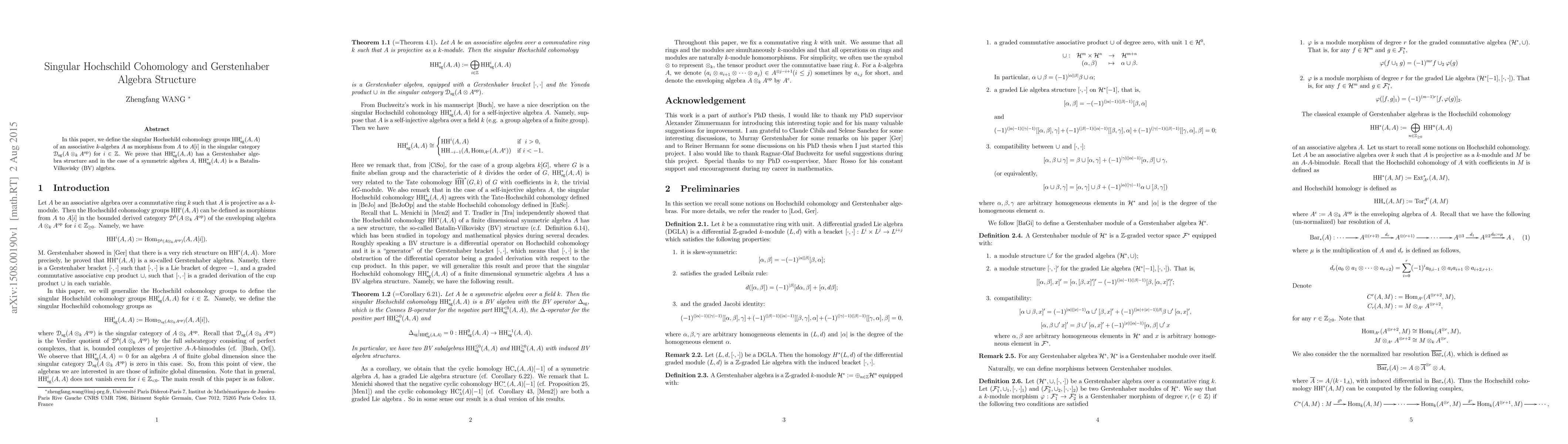 The paper defines and analyzes singular Hochschild cohomology and proves its Gerstenhaber algebra structure, extending previous work on Hochschild cohomology by incorporating singular complexes.