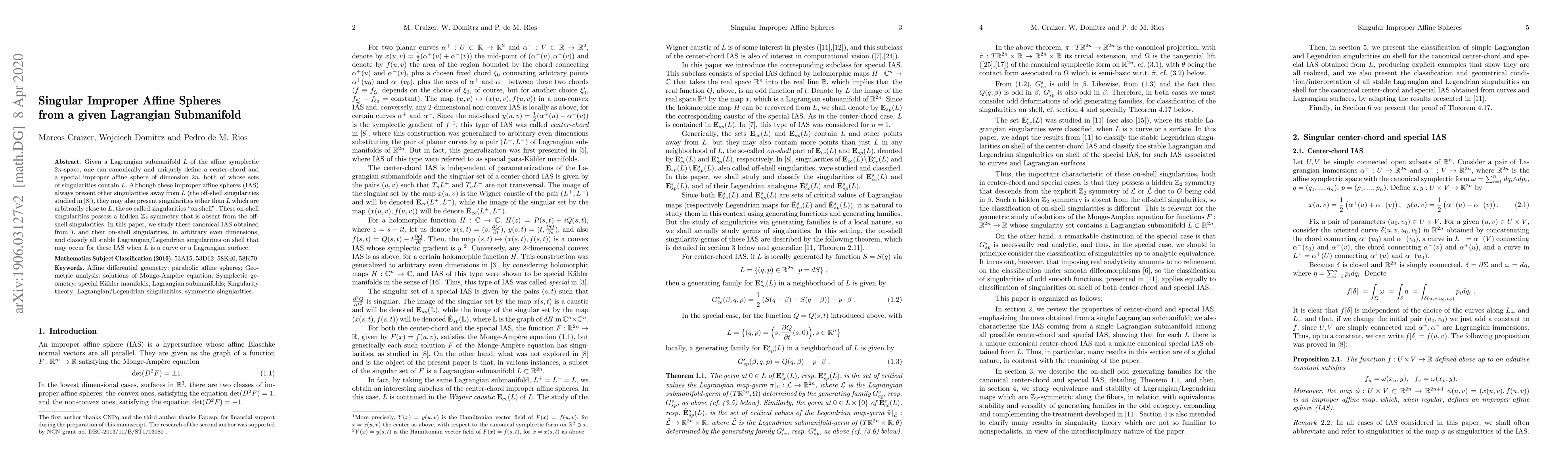 Given a Lagrangian submanifold $L$ of the affine symplectic $2n$-space, one can canonically and uniquely define a center-chord and a special improper affine sphere of dimension $2n$, both of whose sets of singularities contain $L$. Although these improper affine spheres (IAS) always present other singularities away from $L$ (the off-shell singularities studied in our previous paper), they may also present singularities other than $L$ which are arbitrarily close to $L$, the so called singularities "on shell". These on-shell singularities possess a hidden $\mathbb Z_2$ symmetry that is absent from the off-shell singularities. In this paper, we study these canonical IAS obtained from $L$ and their on-shell singularities, in arbitrary even dimensions, and classify all stable Lagrangian/Legendrian singularities on shell that may occur for these IAS when $L$ is a curve or a Lagrangian surface.