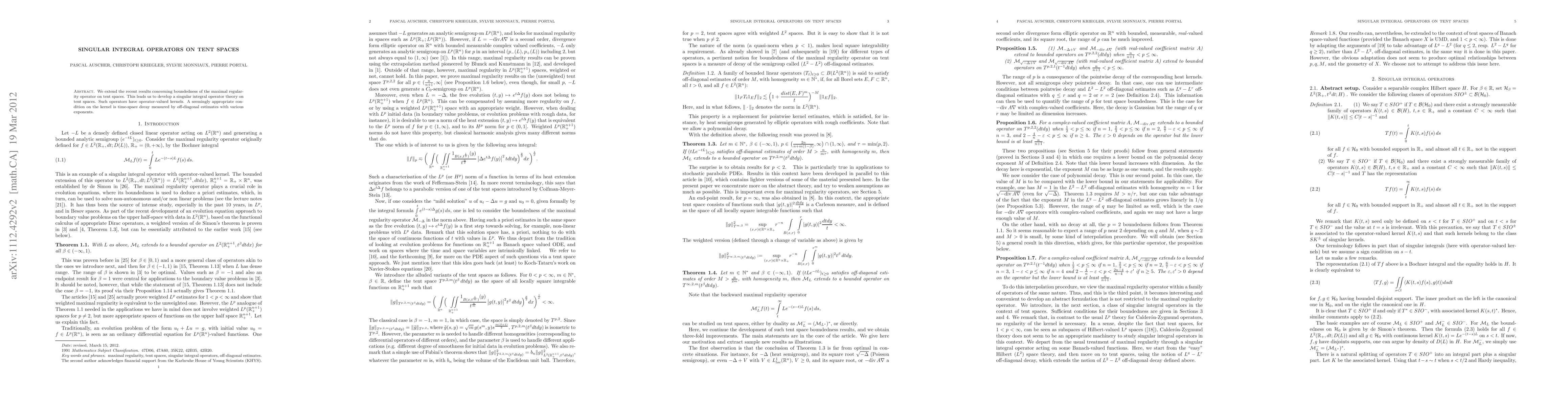 This paper extends the boundedness of maximal regularity operators on tent spaces and develops a singular integral operator theory with operator-valued kernels, emphasizing the importance of time-space decay conditions for the kernel's off-diagonal estimates.
