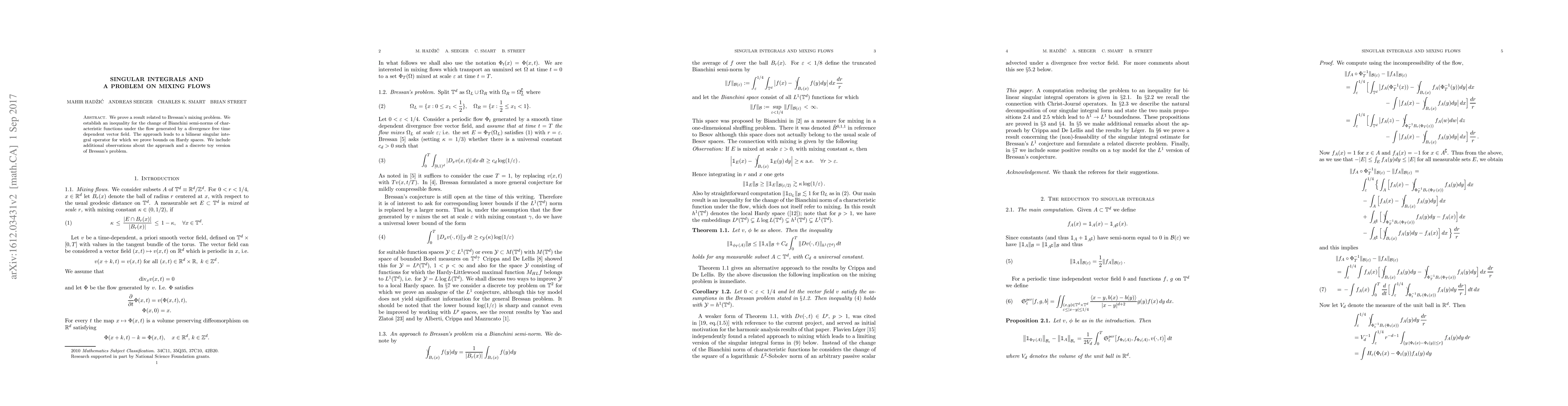 We prove a result related to Bressan's mixing problem. We establish an inequality for the change of Bianchini semi-norms of characteristic functions under the flow generated by a divergence free time dependent vector field. The approach leads to a bilinear singular integral operator for which we prove bounds on Hardy spaces. We include additional observations about the approach and a discrete toy version of Bressan's problem.