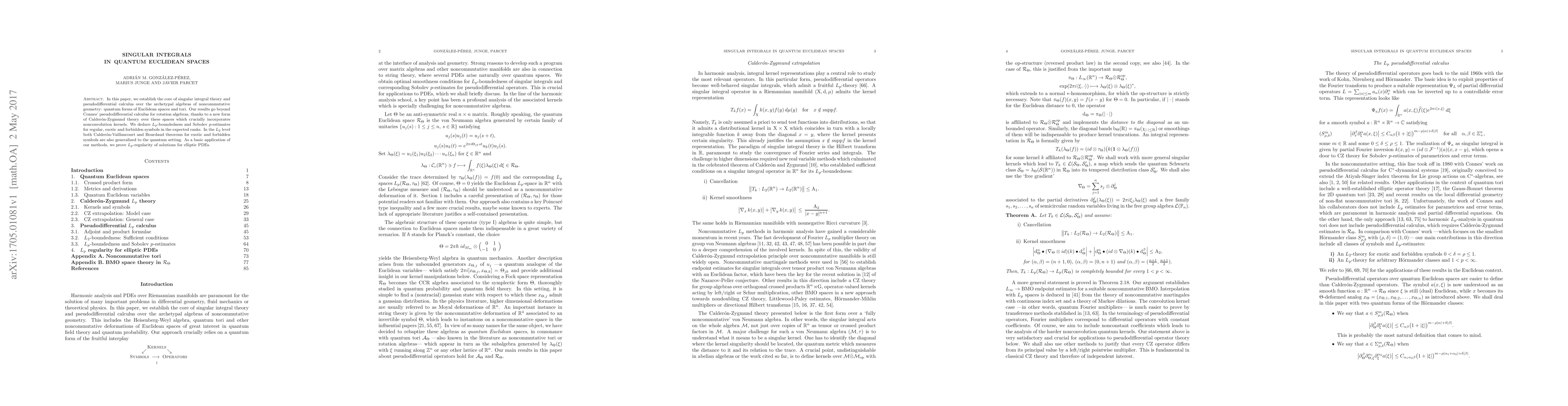 In this paper, we establish the core of singular integral theory and pseudodifferential calculus over the archetypal algebras of noncommutative geometry: quantum forms of Euclidean spaces and tori. Our results go beyond Connes' pseudodifferential calculus for rotation algebras, thanks to a new form of Calder\'on-Zygmund theory over these spaces which crucially incorporates nonconvolution kernels. We deduce $L_p$-boundedness and Sobolev $p$-estimates for regular, exotic and forbidden symbols in the expected ranks. In the $L_2$ level both Calder\'on-Vaillancourt and Bourdaud theorems for exotic and forbidden symbols are also generalized to the quantum setting. As a basic application of our methods, we prove $L_p$-regularity of solutions for elliptic PDEs.