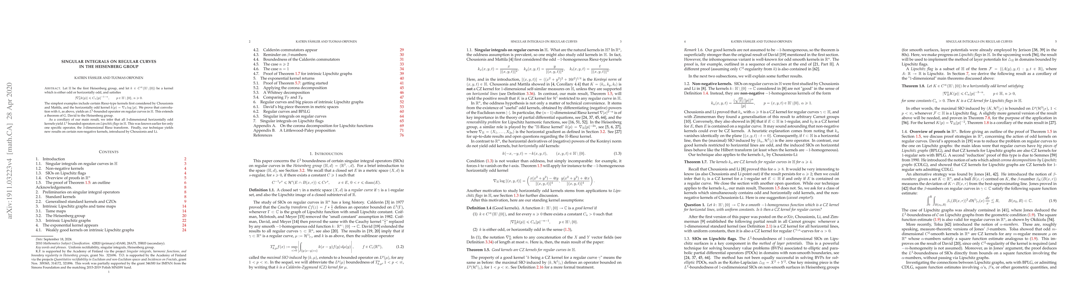 This paper proves that convolution with certain singular integral kernels on the first Heisenberg group yields $L^{2}$-bounded operators on regular curves, extending a theorem by G. David. It also extends the result to all 3-dimensional horizontally odd kernels on Lipschitz flags.