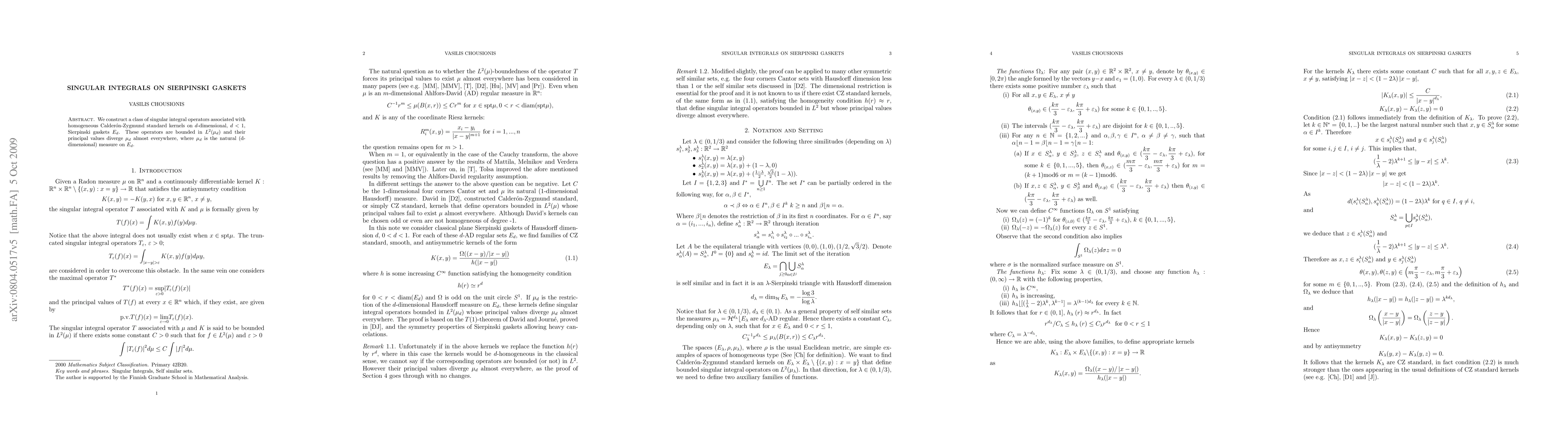 The research constructs singular integral operators associated with homogeneous Calderón-Zygmund standard kernels on d-dimensional Sierpinski gaskets E_d, for d < 1. It proves these operators are bounded in L^2(μ_d) and their principal values diverge μ_d almost everywhere.