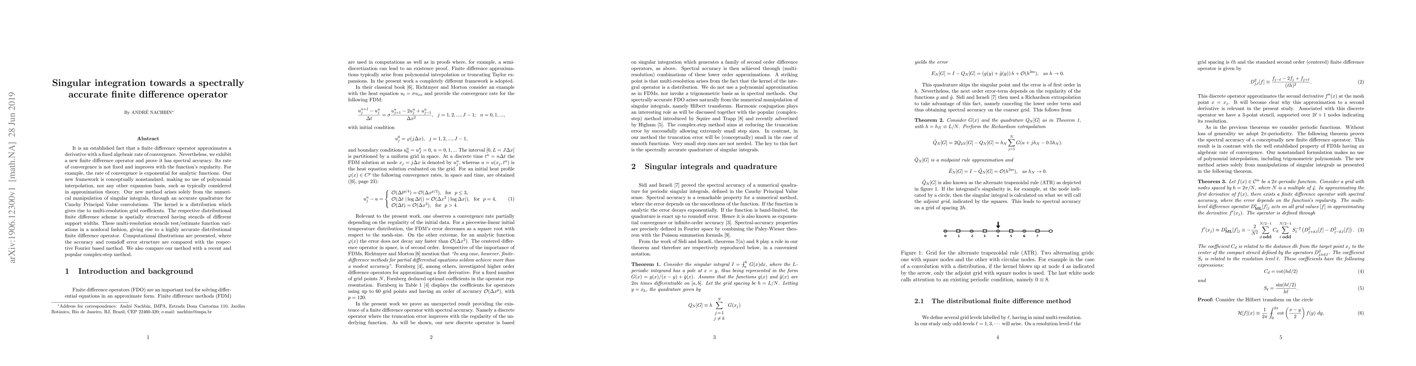 It is an established fact that a finite difference operator approximates a derivative with a fixed algebraic rate of convergence. Nevertheless, we exhibit a new finite difference operator and prove it has spectral accuracy. Its rate of convergence is not fixed and improves with the function's regularity. For example, the rate of convergence is exponential for analytic functions. Our new framework is conceptually nonstandard, making no use of polynomial interpolation, nor any other expansion basis, such as typically considered in approximation theory. Our new method arises solely from the numerical manipulation of singular integrals, through an accurate quadrature for Cauchy Principal Value convolutions. The kernel is a distribution which gives rise to multi-resolution grid coefficients. The respective distributional finite difference scheme is spatially structured having stencils of different support widths. These multi-resolution stencils test/estimate function variations in a nonlocal fashion, giving rise to a highly accurate distributional finite difference operator. Computational illustrations are presented, where the accuracy and roundoff error structure are compared with the respective Fourier based method. We also compare our method with a recent and popular complex-step method.