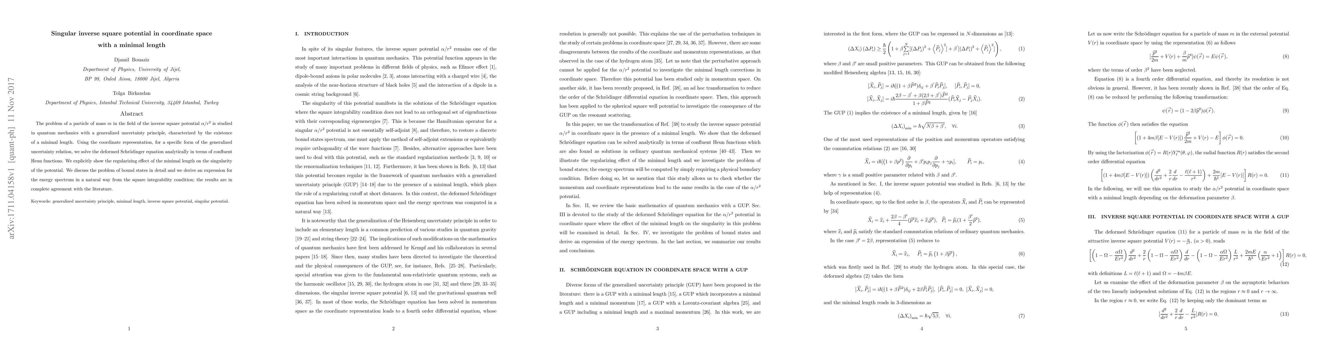 This paper analytically solves the deformed Schrödinger equation for a particle in an inverse square potential under a generalized uncertainty principle that includes a minimal length. It demonstrates the regularizing effect of minimal length on the potential's singularity and derives an energy spectrum consistent with existing literature.