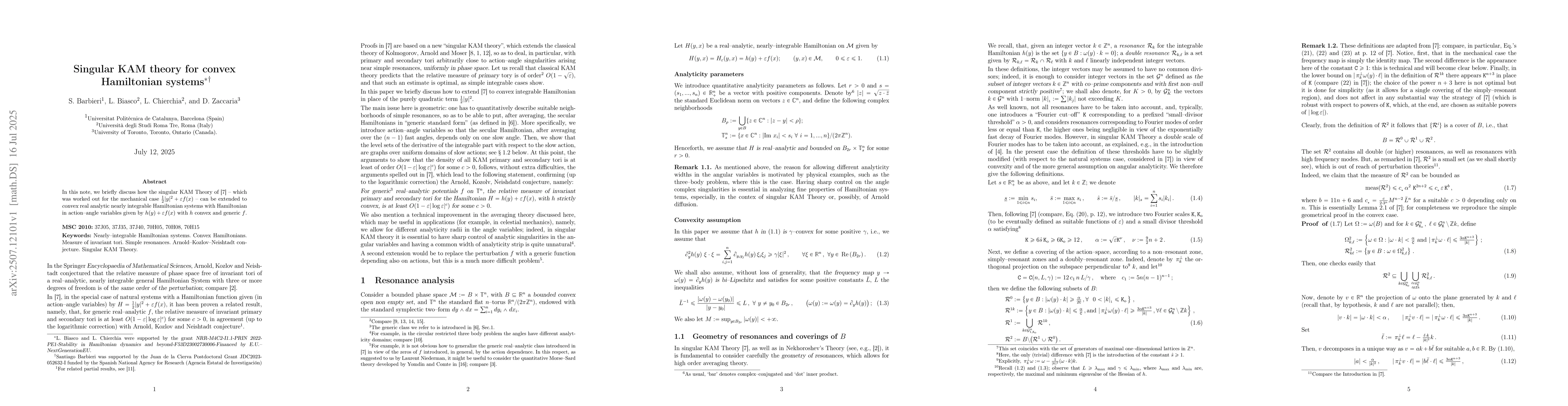 In this note, we briefly discuss how singular KAM Theory - which was worked out in a previous work by L.B. and L.C. for the mechanical case $\frac12 |y|^2+\varepsilon f(x)$ - can be extended to convex real analytic nearly integrable Hamiltonian systems with Hamiltonian in action-angle variables given by $h(y)+\varepsilon f(x)$ with $h$ convex and generic $f$.