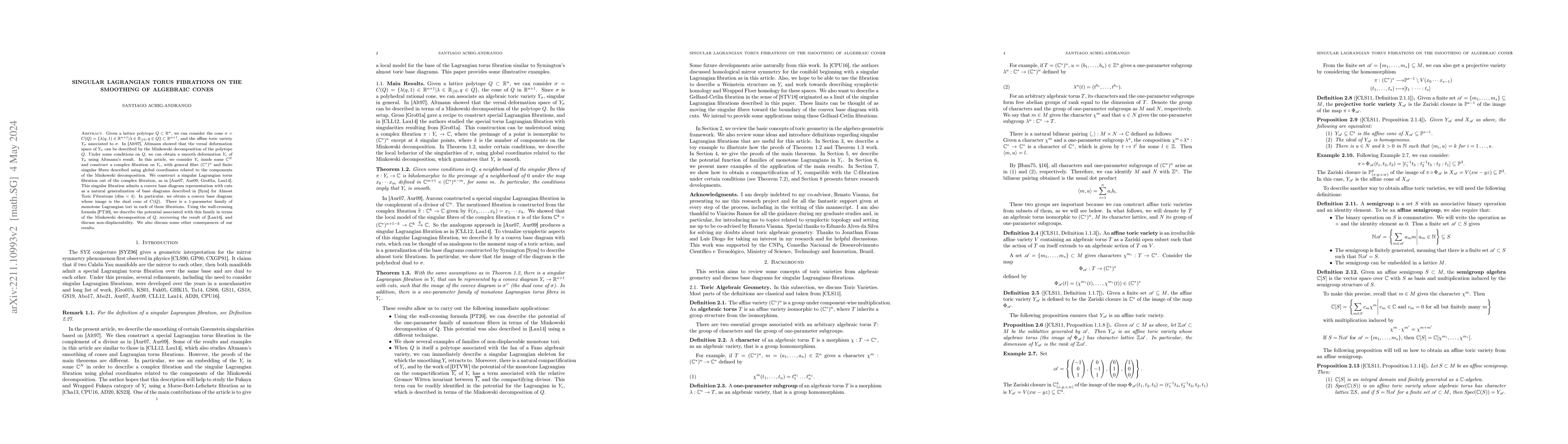This paper studies smooth deformations of affine toric varieties associated with lattice polytopes, constructing a singular Lagrangian torus fibration. It generalizes base diagrams and relates the fibration's potential to the polytope's Minkowski decomposition, addressing non-displaceability and other implications.