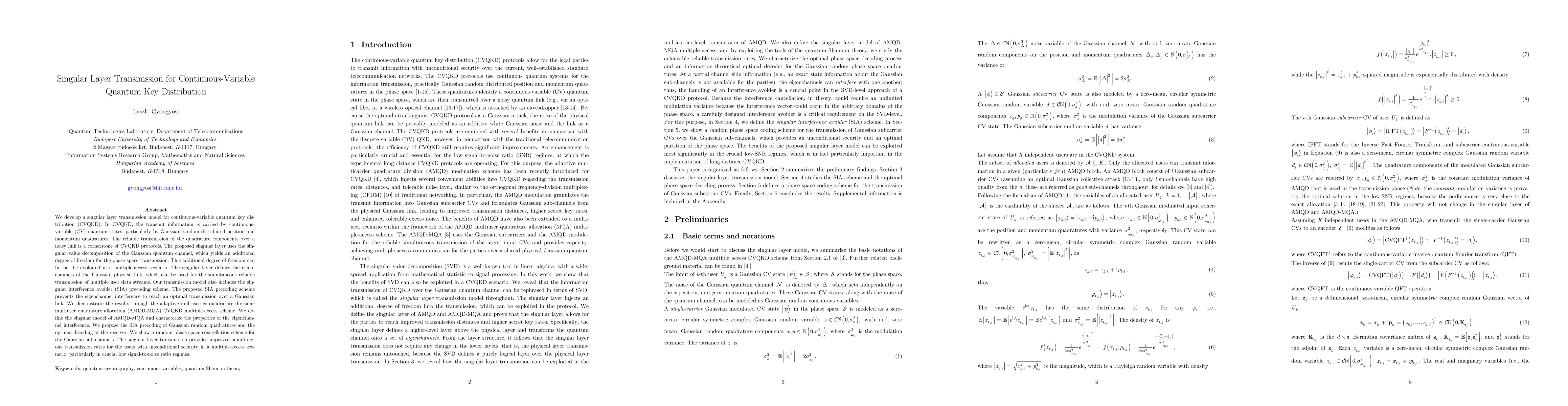 We develop a singular layer transmission model for continuous-variable quantum key distribution (CVQKD). In CVQKD, the transmit information is carried by continuous-variable (CV) quantum states, particularly by Gaussian random distributed position and momentum quadratures. The reliable transmission of the quadrature components over a noisy link is a cornerstone of CVQKD protocols. The proposed singular layer uses the singular value decomposition of the Gaussian quantum channel, which yields an additional degree of freedom for the phase space transmission. This additional degree of freedom can further be exploited in a multiple-access scenario. The singular layer defines the eigenchannels of the Gaussian physical link, which can be used for the simultaneous reliable transmission of multiple user data streams. Our transmission model also includes the singular interference avoider (SIA) precoding scheme. The proposed SIA precoding scheme prevents the eigenchannel interference to reach an optimal transmission over a Gaussian link. We demonstrate the results through the adaptive multicarrier quadrature division-multiuser quadrature allocation (AMQD-MQA) CVQKD multiple-access scheme. We define the singular model of AMQD-MQA and characterize the properties of the eigenchannel interference. We propose the SIA precoding of Gaussian random quadratures and the optimal decoding at the receiver. We show a random phase space constellation scheme for the Gaussian sub-channels. The singular layer transmission provides improved simultaneous transmission rates for the users with unconditional security in a multiple-access scenario, particularly in crucial low signal-to-noise ratio regimes.