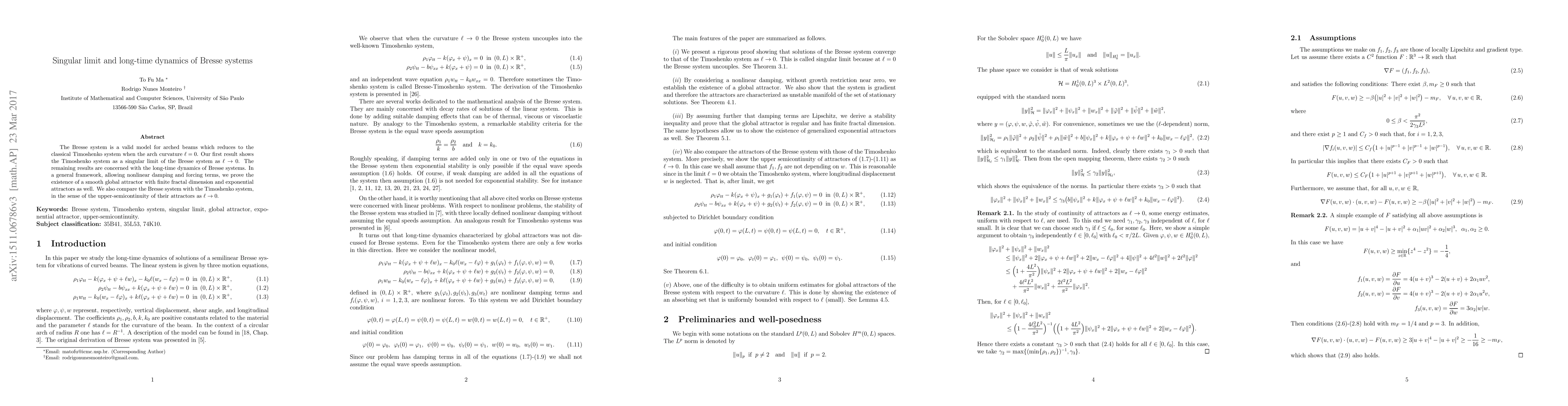 This paper investigates the singular limit and long-term dynamics of Bresse systems modeling arched beams, showing that the Timoshenko system emerges as a limit when the arch curvature approaches zero. It also proves the existence of a smooth global attractor and exponential attractors for the Bresse system under nonlinear damping and forcing, and compares the attractors of Bresse and Timoshenko systems as the curvature tends to zero.