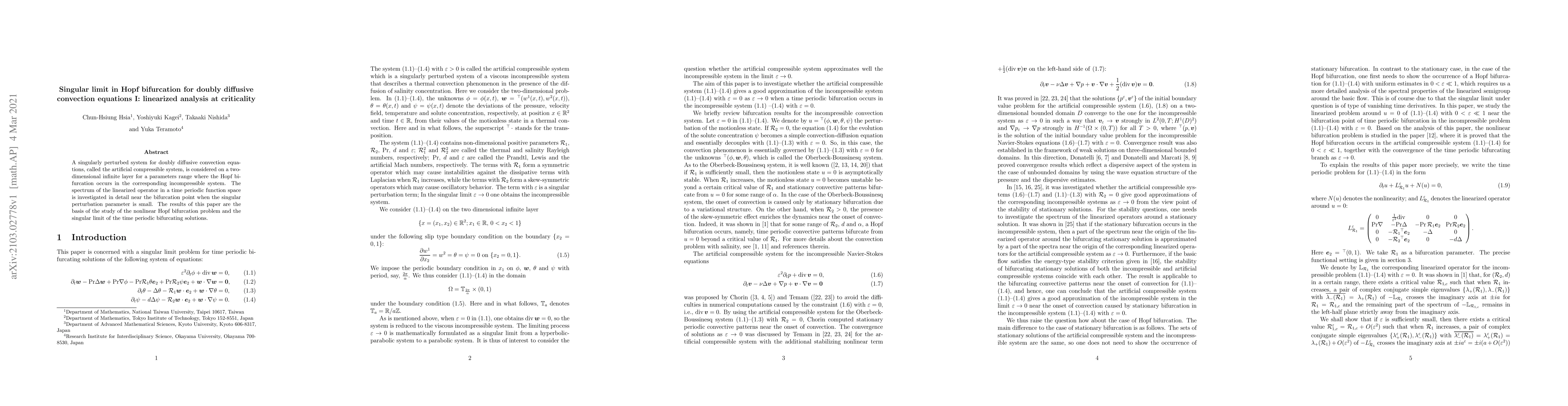 This paper investigates the linearized analysis near the Hopf bifurcation point for a singularly perturbed system of doubly diffusive convection equations, focusing on the artificial compressible system in a two-dimensional infinite layer. The study provides foundational results for understanding the nonlinear Hopf bifurcation problem and the singular limit of time periodic bifurcating solutions.