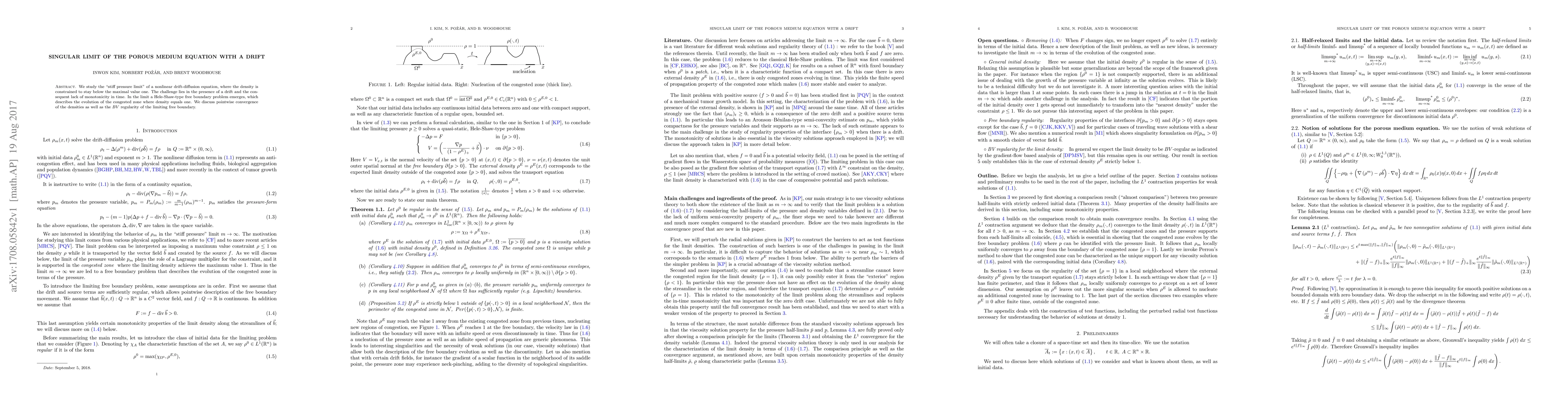 A research paper studies the singular limit of a nonlinear drift-diffusion equation as density equals one, revealing a Hele-Shaw-type free boundary problem that describes the evolution of the congested zone.