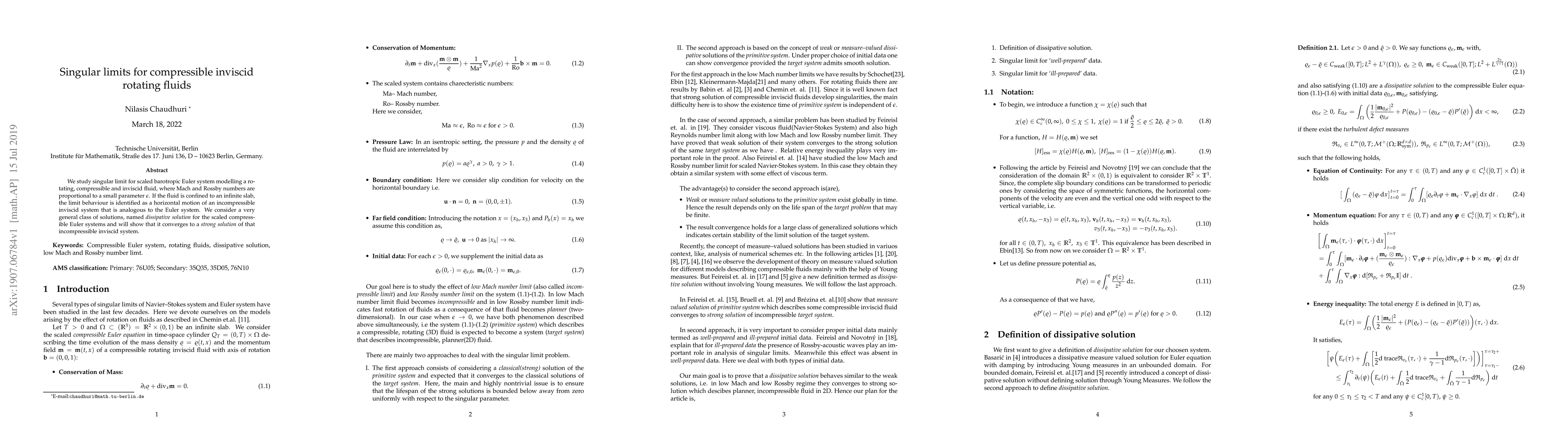 This paper investigates the singular limit behavior of a scaled barotropic Euler system modeling a rotating, compressible, and inviscid fluid, where the Mach and Rossby numbers scale with a small parameter $\epsilon$. It identifies the limit as a horizontal motion analogous to the incompressible Euler system and demonstrates convergence of dissipative solutions to strong solutions of the incompressible system.