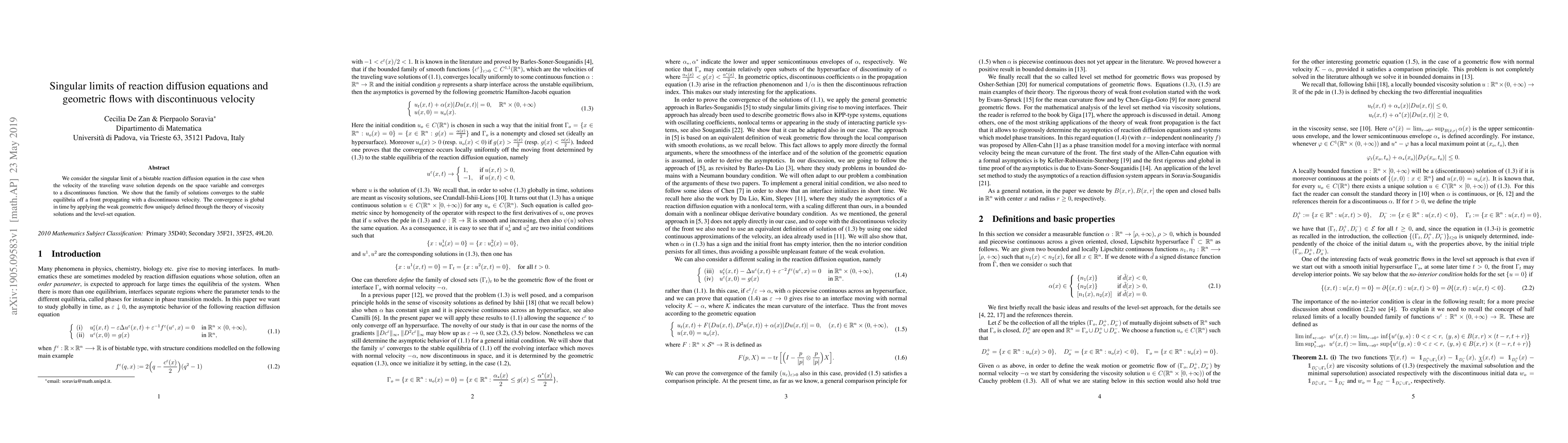 We consider the singular limit of a bistable reaction diffusion equation in the case when the velocity of the traveling wave solution depends on the space variable and converges to a discontinuous function. We show that the family of solutions converges to the stable equilibria off a front propagating with a discontinuous velocity. The convergence is global in time by applying the weak geometric flow uniquely defined through the theory of viscosity solutions and the level-set equation.