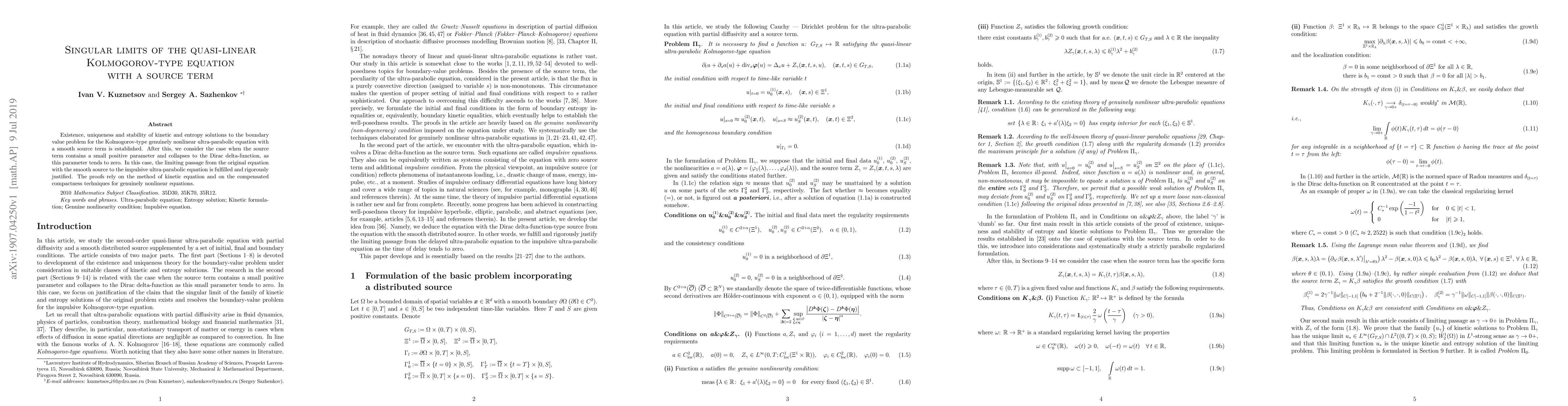 Existence, uniqueness and stability of kinetic and entropy solutions to the boundary value problem for the Kolmogorov-type genuinely nonlinear ultra-parabolic equation with a smooth source term is established. After this, we consider the case when the source term contains a small positive parameter and collapses to the Dirac delta-function, as this parameter tends to zero. In this case, the limiting passage from the original equation with the smooth source to the impulsive ultra-parabolic equation is fulfilled and rigorously justified. The proofs rely on the method of kinetic equation and on the compensated compactness techniques for genuinely nonlinear equations.