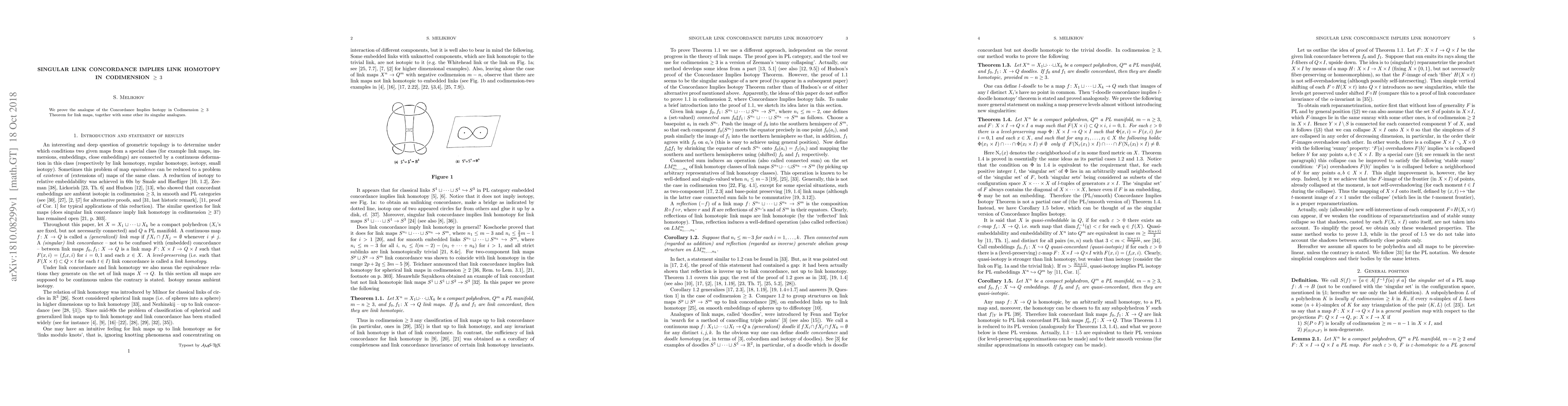 We prove the analogue of the Concordance Implies Isotopy in Codimension $\ge 3$ Theorem for link maps, together with some other its singular analogues. In the case of spherical link maps, a stronger result was independently obtained by P. Teichner (by different methods).