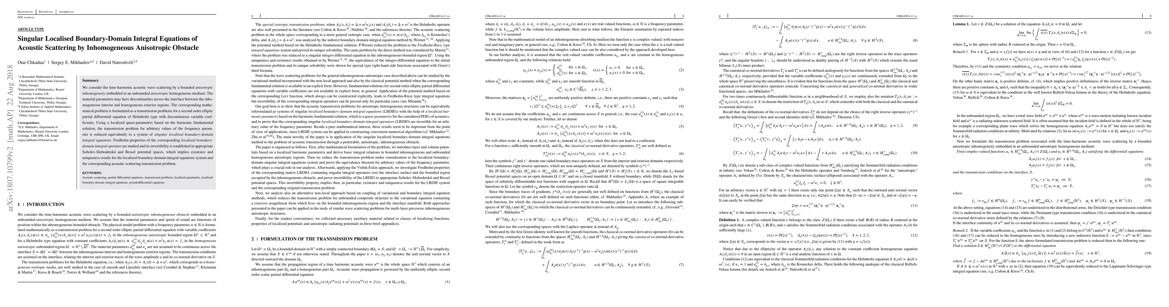 This paper investigates the scattering of time-harmonic acoustic waves by an anisotropic inhomogeneous obstacle in an anisotropic medium, formulating it as a transmission problem for a Helmholtz equation. It reduces the problem to singular localised boundary-domain integral equations, proving their Fredholm properties and invertibility, thereby ensuring existence and uniqueness of solutions.