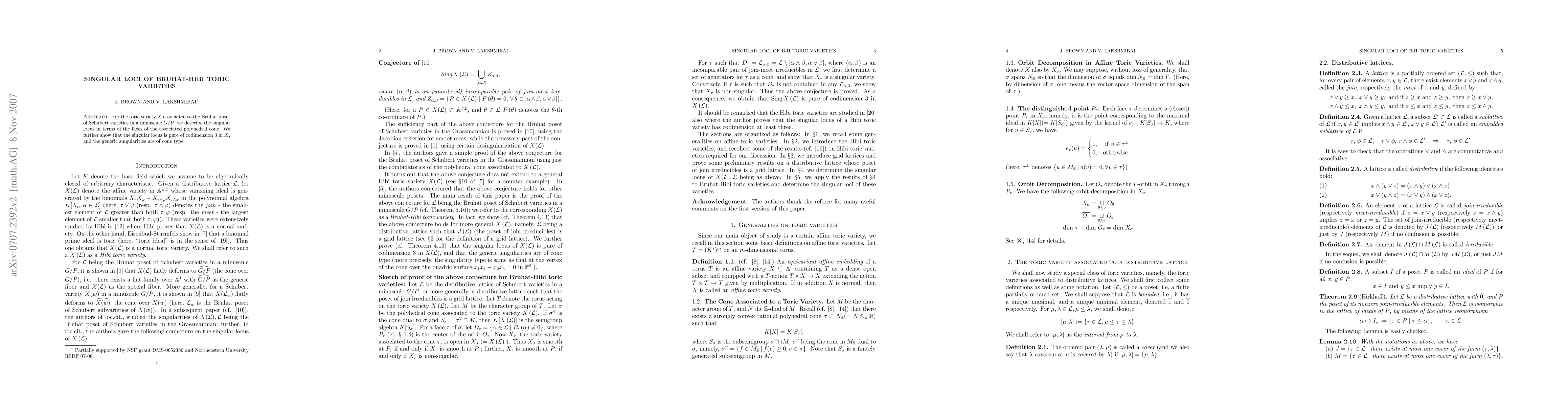 The paper describes the singular loci of Bruhat-Hibi toric varieties linked to minuscule G/P, demonstrating that these singular loci correspond to the faces of the associated polyhedral cone and are pure of codimension 3 within the toric variety.