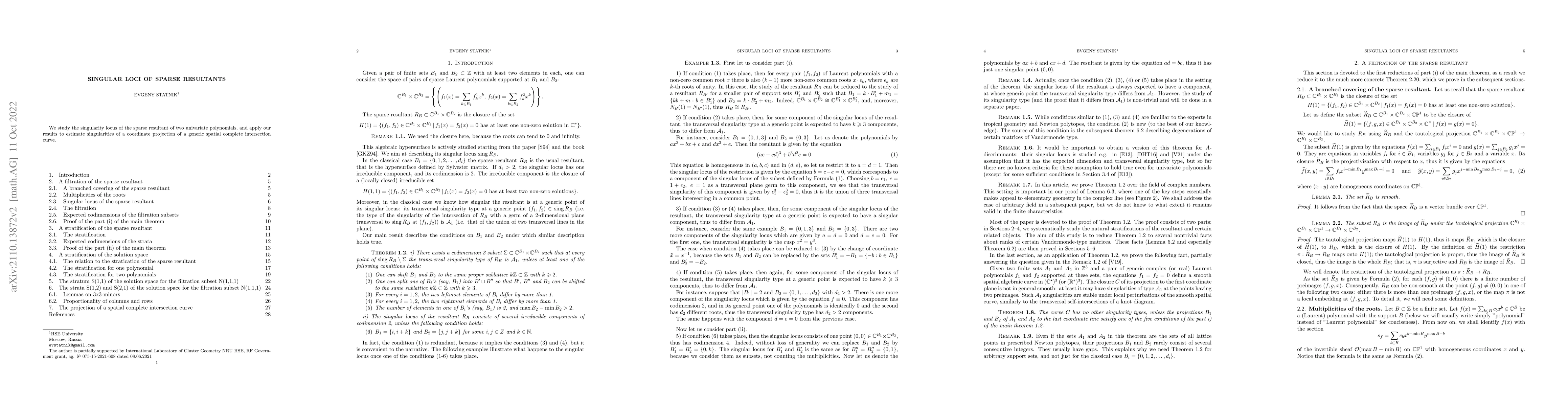 This paper investigates the singularity locus of the sparse resultant of two univariate polynomials and uses these findings to estimate the singularities in the coordinate projection of a generic spatial complete intersection curve.
