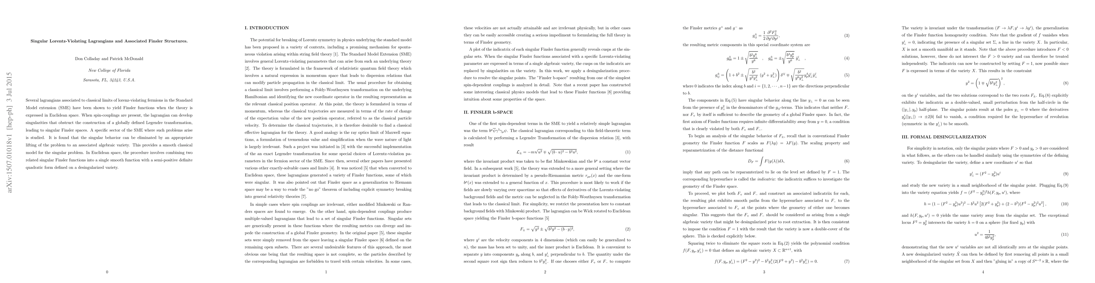 This paper investigates singular Lorentz-violating fermionic Lagrangians in the Standard Model extension, revealing that they yield singular Finsler structures. By lifting the problem to an associated algebraic variety, the authors desingularize the model, providing a smooth classical framework.