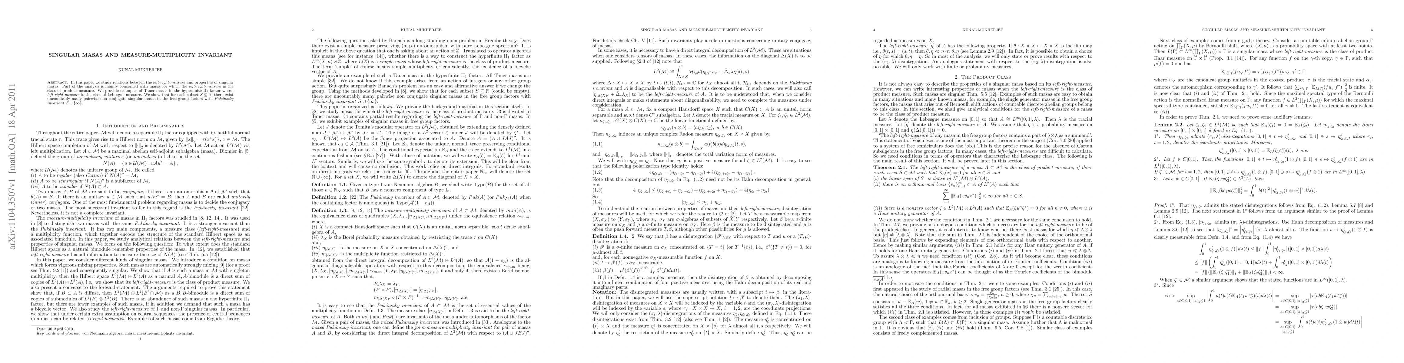 This paper investigates the relationship between left-right-measure and singular masas, particularly focusing on masas with product measures like Lebesgue measure. It presents examples of Tauer masas in hyperfinite $\rm{II}_{1}$ factors and demonstrates the existence of uncountably many non-conjugate singular masas in free group factors with specific Pukánszky invariants.