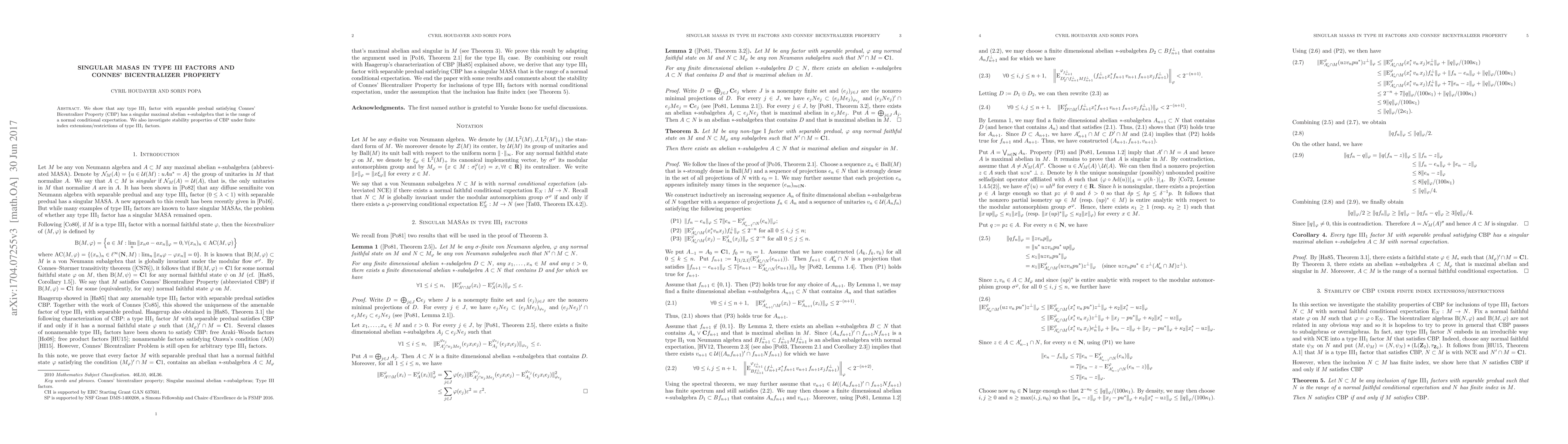 We show that any type ${\rm III_1}$ factor with separable predual satisfying Connes' Bicentralizer Property (CBP) has a singular maximal abelian $\ast$-subalgebra that is the range of a normal conditional expectation. We also investigate stability properties of CBP under finite index extensions/restrictions of type ${\rm III_1}$ factors.
