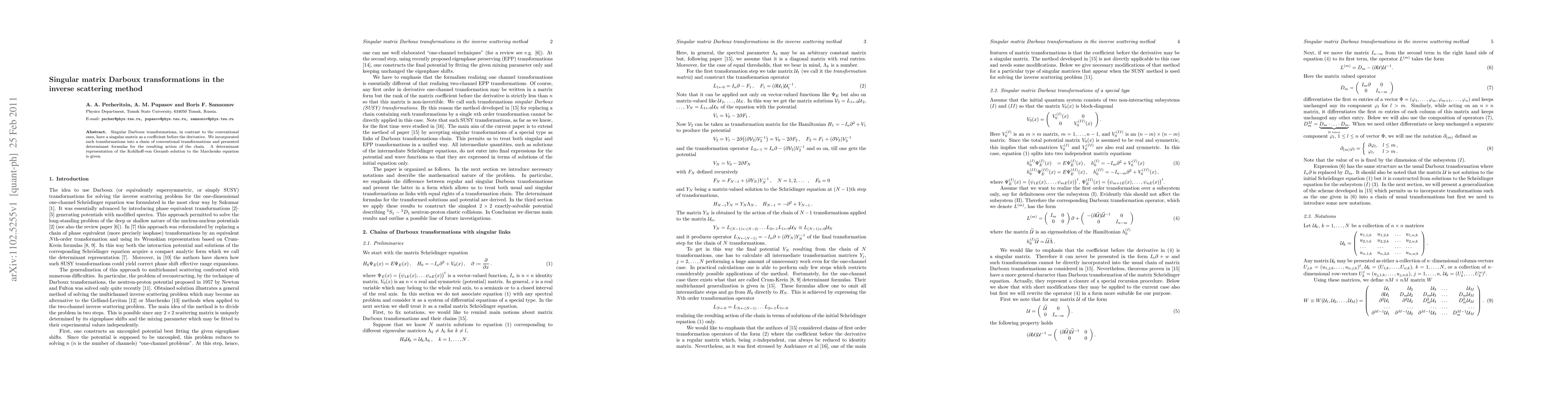 Singular Darboux transformations, in contrast to the conventional ones, have a singular matrix as a coefficient before the derivative. We incorporated such transformations into a chain of conventional transformations and presented determinant formulas for the resulting action of the chain. A determinant representation of the Kohlhoff-von Geramb solution to the Marchenko equation is given.