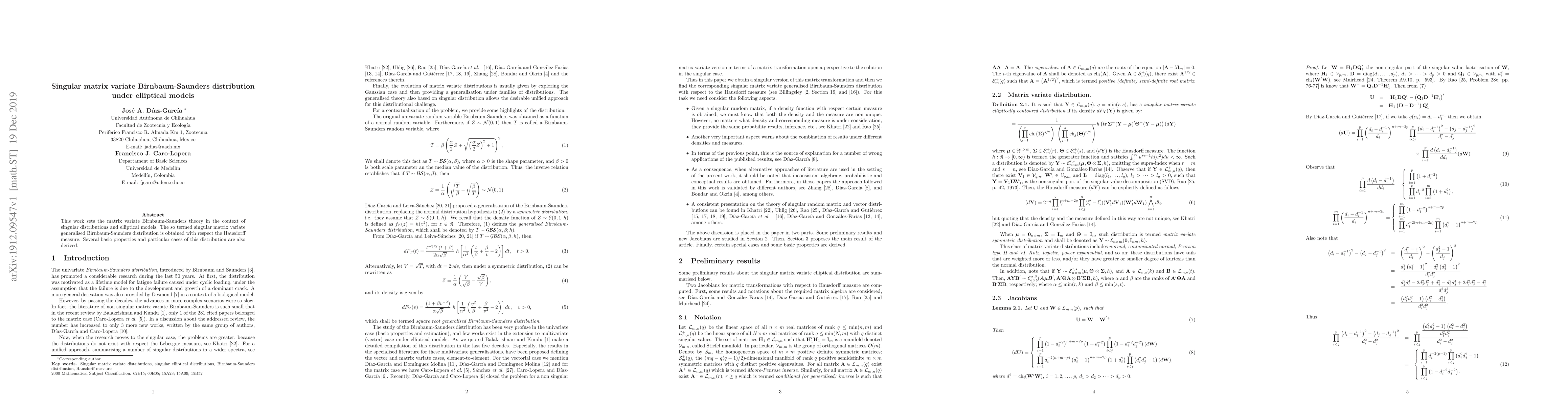 This paper develops the singular matrix variate Birnbaum-Saunders distribution within elliptical models, deriving its properties and specific instances using the Hausdorff measure. The focus is on establishing the theoretical framework for this novel distribution.