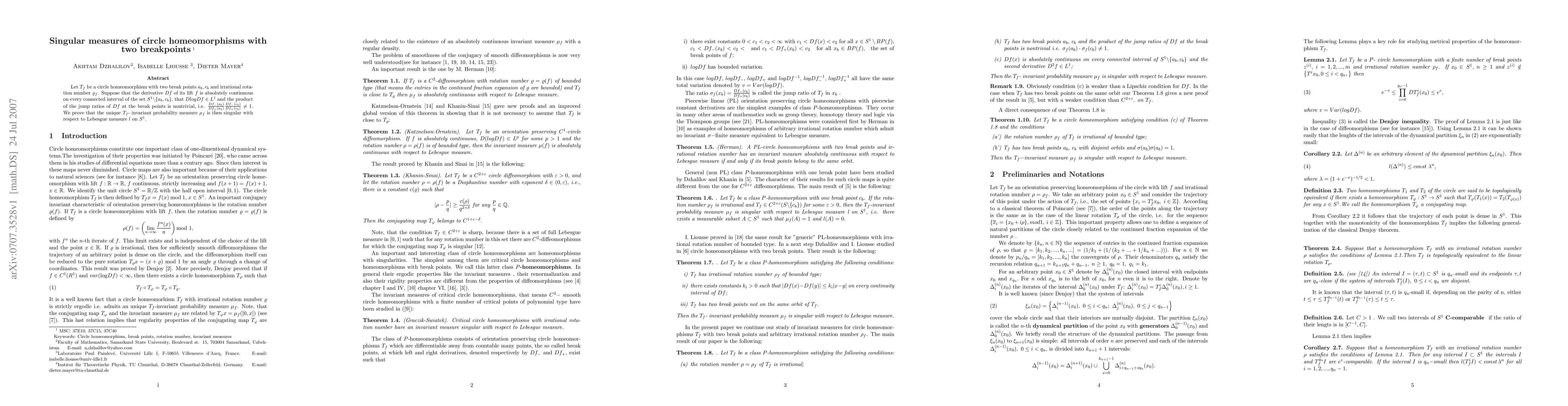 A circle homeomorphism with two break points has a unique invariant probability measure that is singular to Lebesgue measure on the circle, given certain conditions on its derivative and logarithmic derivative.