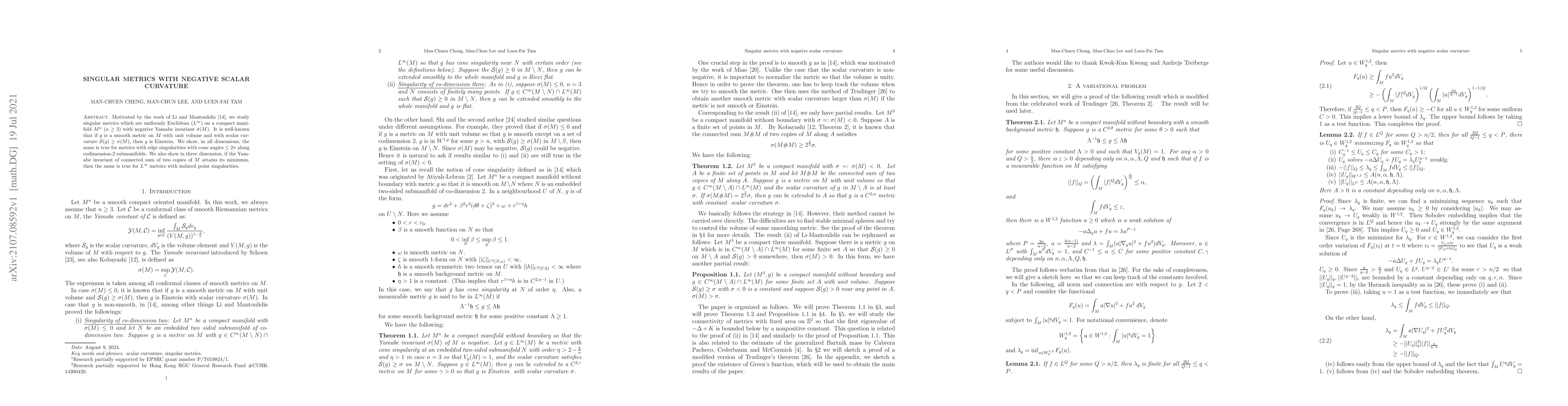 Researchers study singular metrics with negative scalar curvature on compact manifolds, finding that such metrics are Einstein in all dimensions if they have certain types of edge singularities.
