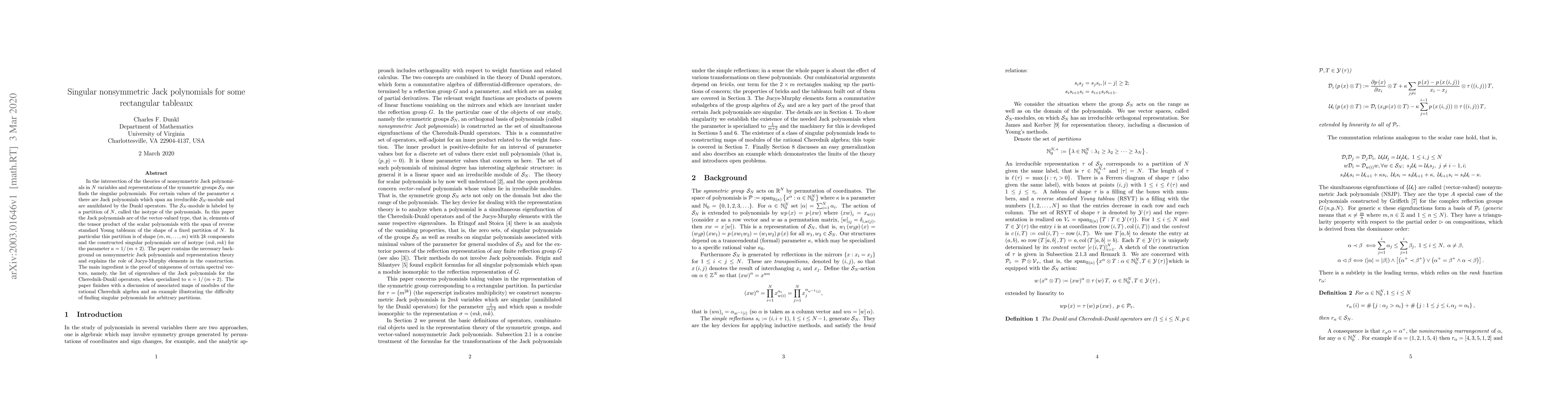 In the intersection of the theories of nonsymmetric Jack polynomials in $N$ variables and representations of the symmetric groups $\mathcal{S}_{N}$ one finds the singular polynomials. For certain values of the parameter $\kappa$ there are Jack polynomials which span an irreducible $\mathcal{S}_{N}$-module and are annihilated by the Dunkl operators. The $\mathcal{S}_{N}$-module is labeled by a partition of $N$, called the isotype of the polynomials. In this paper the Jack polynomials are of the vector-valued type, that is, elements of the tensor product of the scalar polynomials with the span of reverse standard Young tableaux of the shape of a fixed partition of $N$. In particular this partition is of shape $\left( m,m,\ldots,m\right) $ with $2k$ components and the constructed singular polynomials are of isotype $\left( mk,mk\right) $ for the parameter $\kappa=$ $1/\left( m+2\right) $. The paper contains the necessary background on nonsymmetric Jack polynomials and representation theory and explains the role of Jucys-Murphy elements in the construction. The main ingredient is the proof of uniqueness of certain spectral vectors, namely, the list of eigenvalues of the Jack polynomials for the Cherednik-Dunkl operators, when specialized to $\kappa=1/\left( m+2\right) $. The paper finishes with a discussion of associated maps of modules of the rational Cherednik algebra and an example illustrating the difficulty of finding singular polynomials for arbitrary partitions.