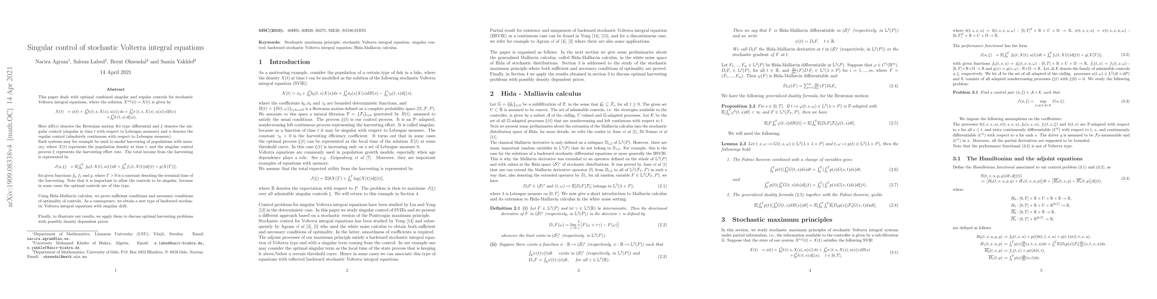 This paper develops a new framework for optimal control of stochastic Volterra integral equations, allowing for singular controls and providing sufficient conditions for optimality, with applications to harvesting problems.