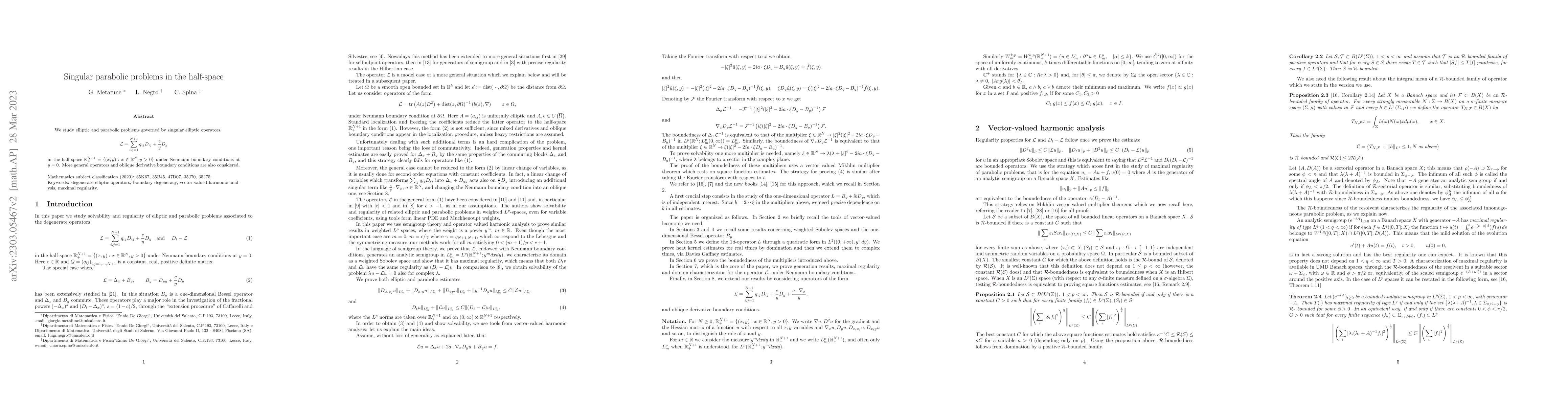 This paper investigates elliptic and parabolic problems driven by singular elliptic operators in the upper half-space $\mathbb{R}^{N+1}_+$, focusing on Neumann boundary conditions at $y=0$. The study also explores more general operators and oblique derivative boundary conditions.