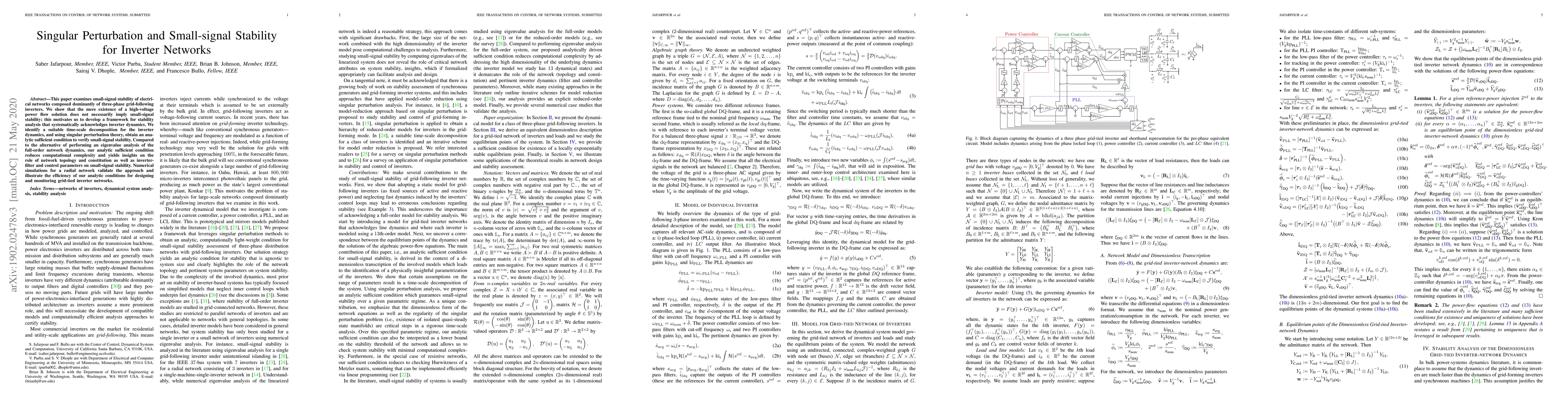 This paper develops a framework for analyzing small-signal stability in inverter networks using singular perturbation theory, showing that high-voltage power flow does not guarantee stability. It provides an analytic sufficient condition that reduces computational complexity compared to full-order eigenvalue analysis, validated through numerical simulations on a radial network.
