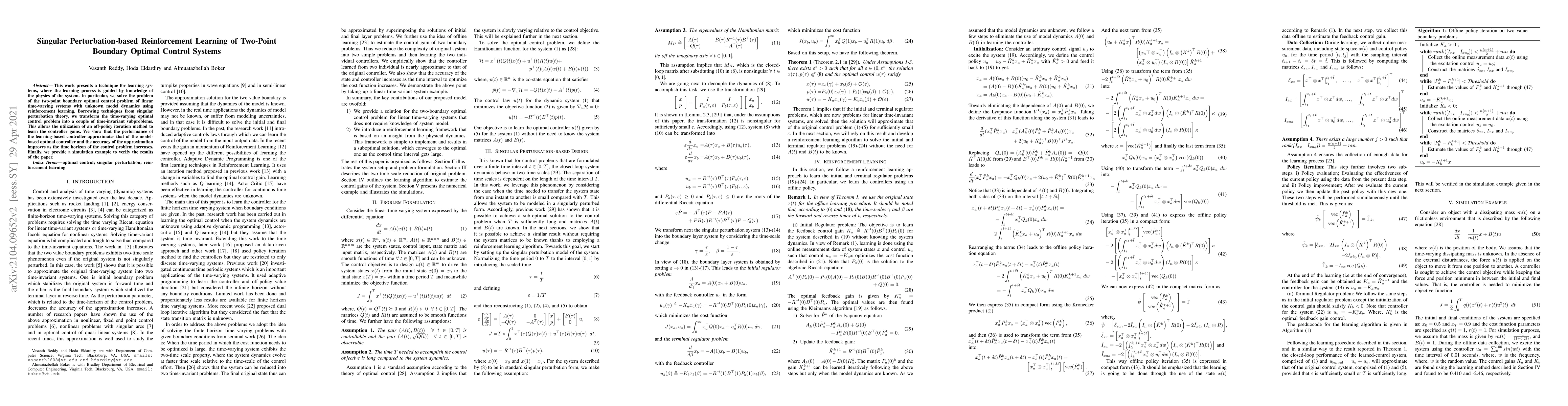 This paper develops a reinforcement learning approach to solve the two-point boundary optimal control problem for linear time-varying systems with unknown dynamics, leveraging singular perturbation theory to simplify the problem. The method approximates the performance of a model-based optimal controller, with accuracy improving over longer time horizons.