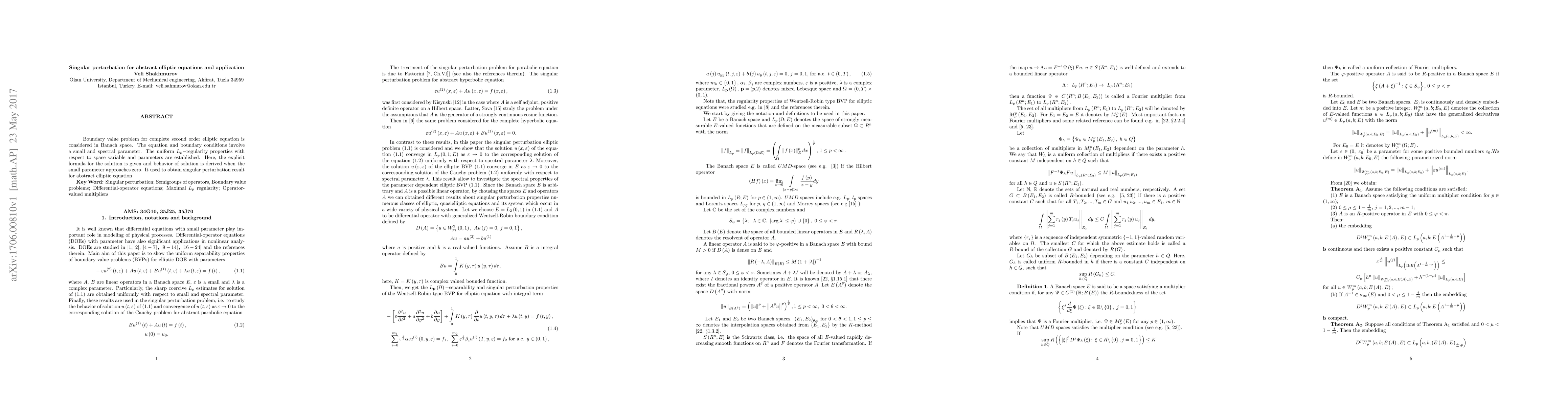 Researchers developed a method to solve abstract elliptic equations involving small parameters, establishing regularity properties and an explicit solution formula. The study applies this technique to obtain singular perturbation results for these types of equations.