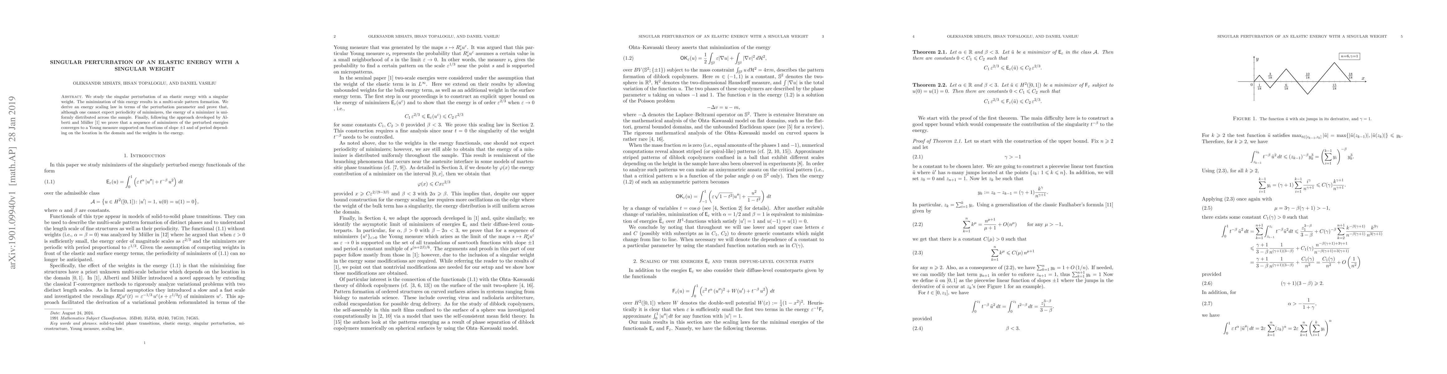 We study the singular perturbation of an elastic energy with a singular weight. The minimization of this energy results in a multi-scale pattern formation. We derive an energy scaling law in terms of the perturbation parameter and prove that, although one cannot expect periodicity of minimizers, the energy of a minimizer is uniformly distributed across the sample. Finally, following the approach developed by Alberti and M\"{u}ller in 2001 we prove that a sequence of minimizers of the perturbed energies converges to a Young measure supported on functions of slope $\pm 1$ and of period depending on the location in the domain and the weights in the energy.